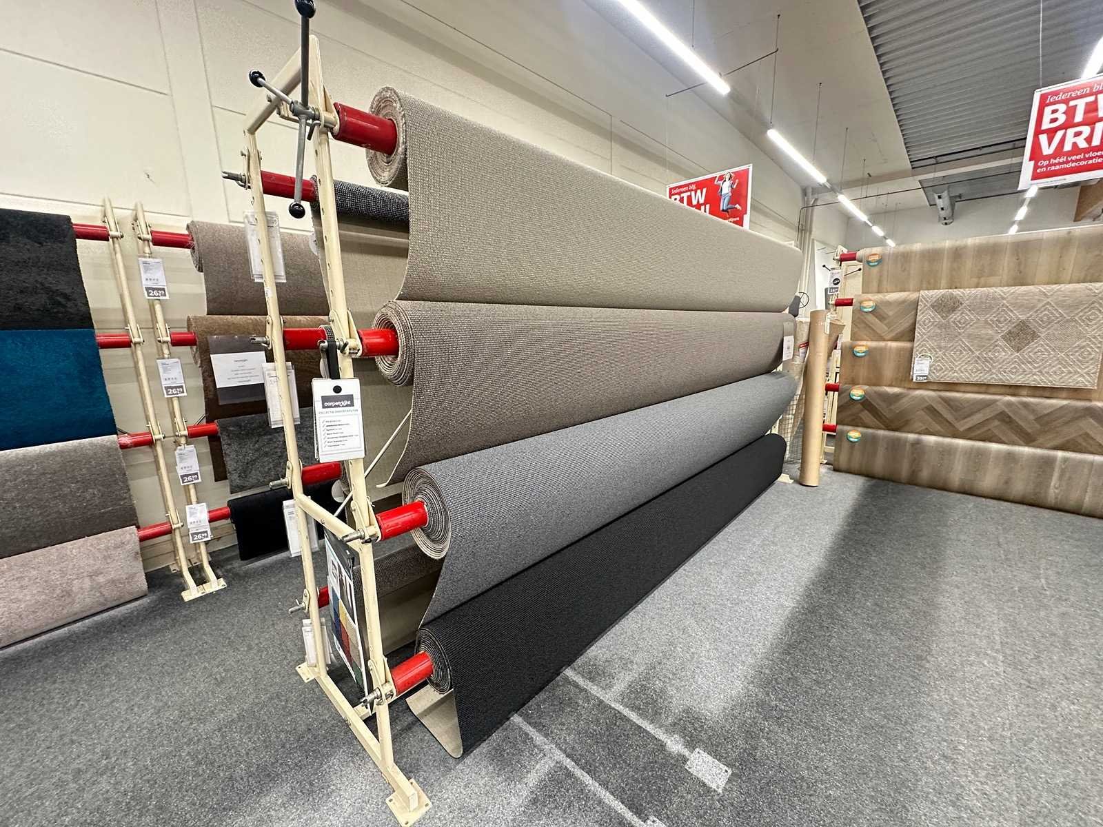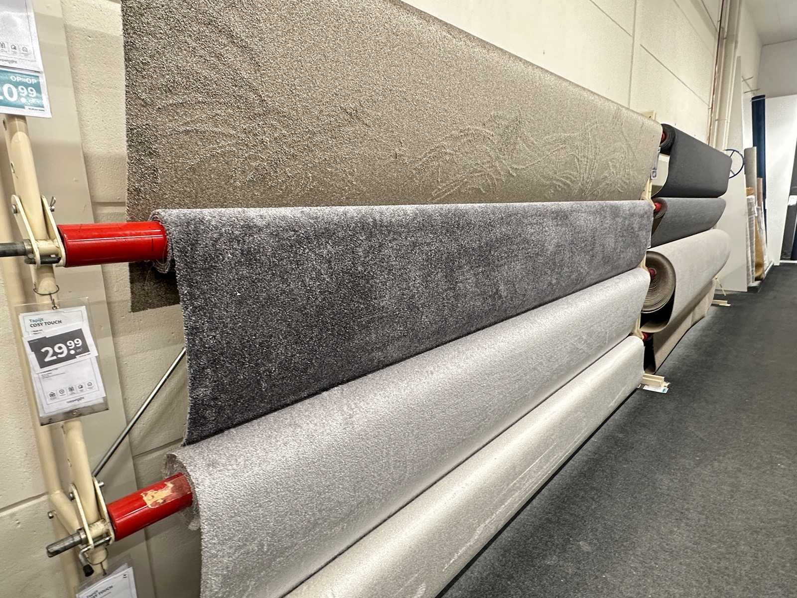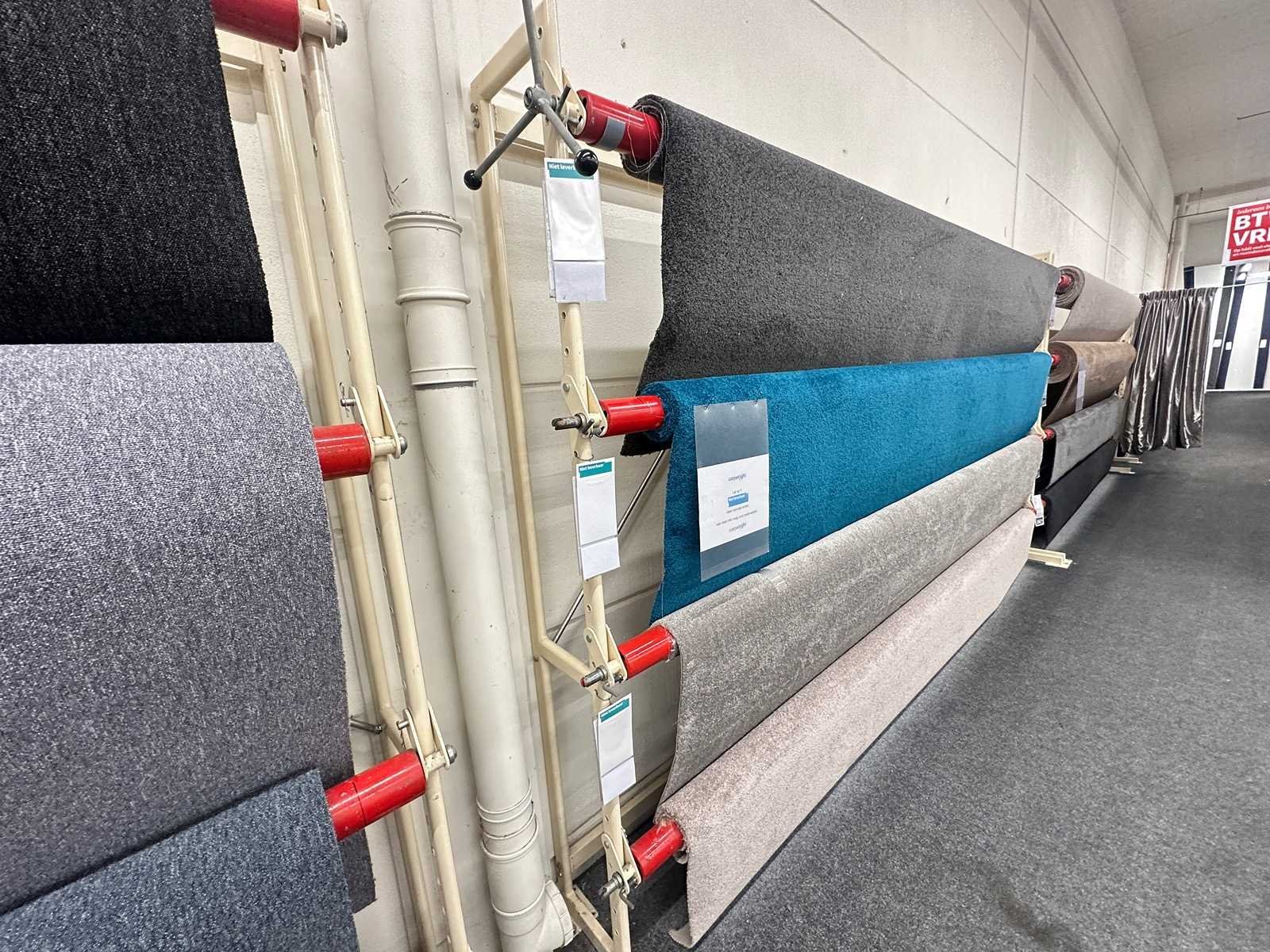 Deze partij bestaat uit diverse soorten vloerbedekking op 20 rekken. Verschillende afmetingen en kleuren. Exclusief rekken.
