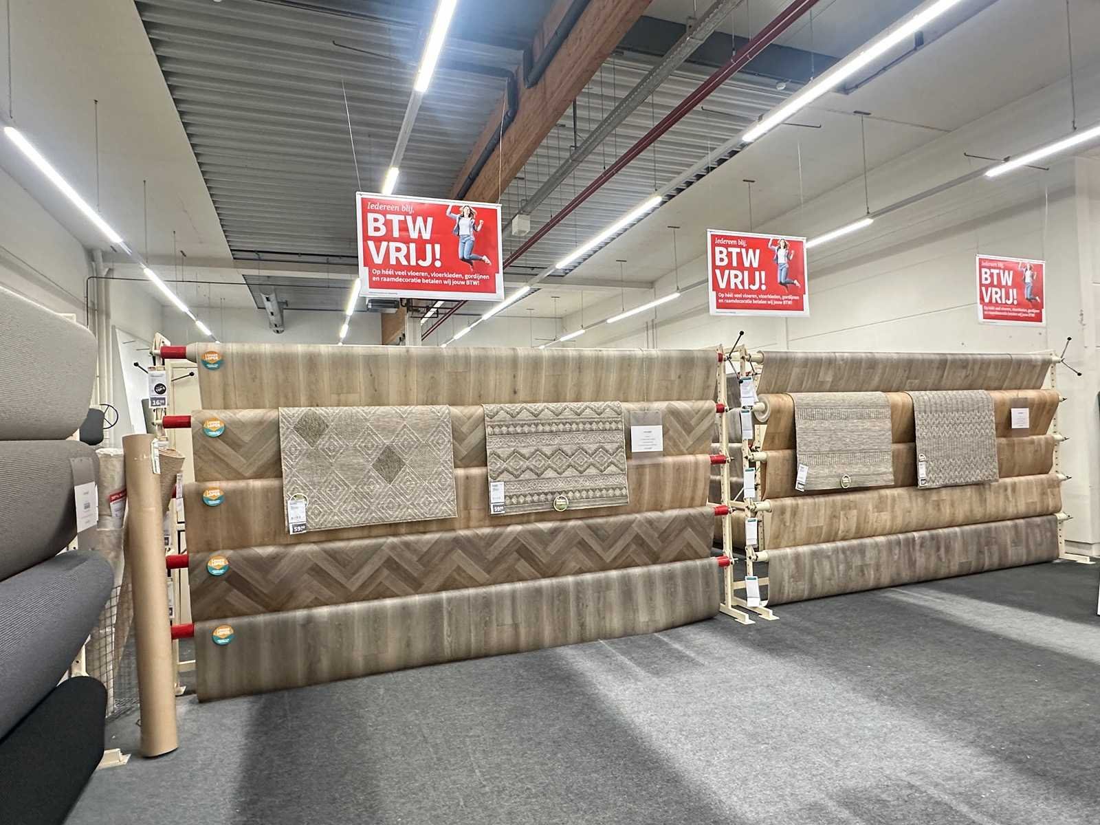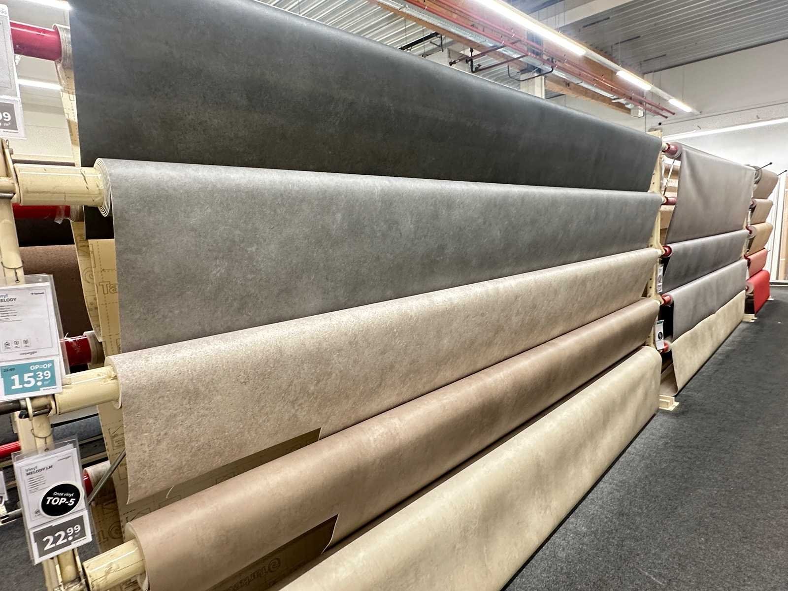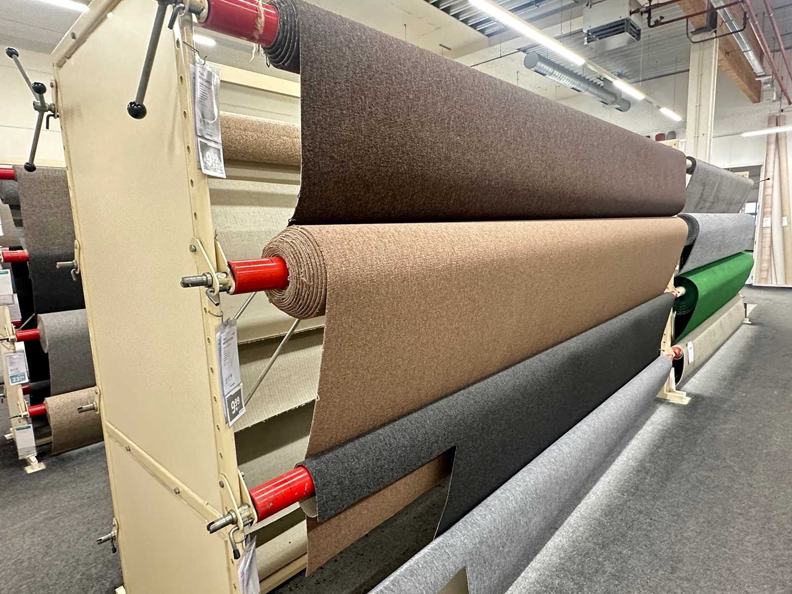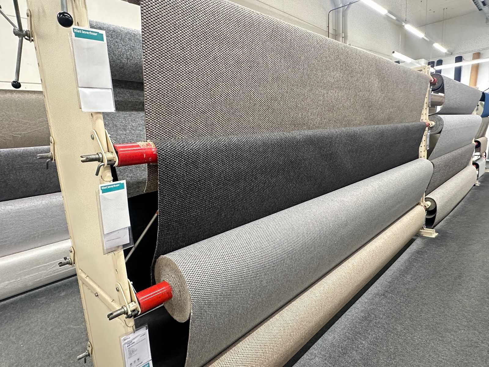 Deze partij bestaat uit diverse soorten vloerbedekking op 20 rekken. Verschillende afmetingen en kleuren. Exclusief rekken.
