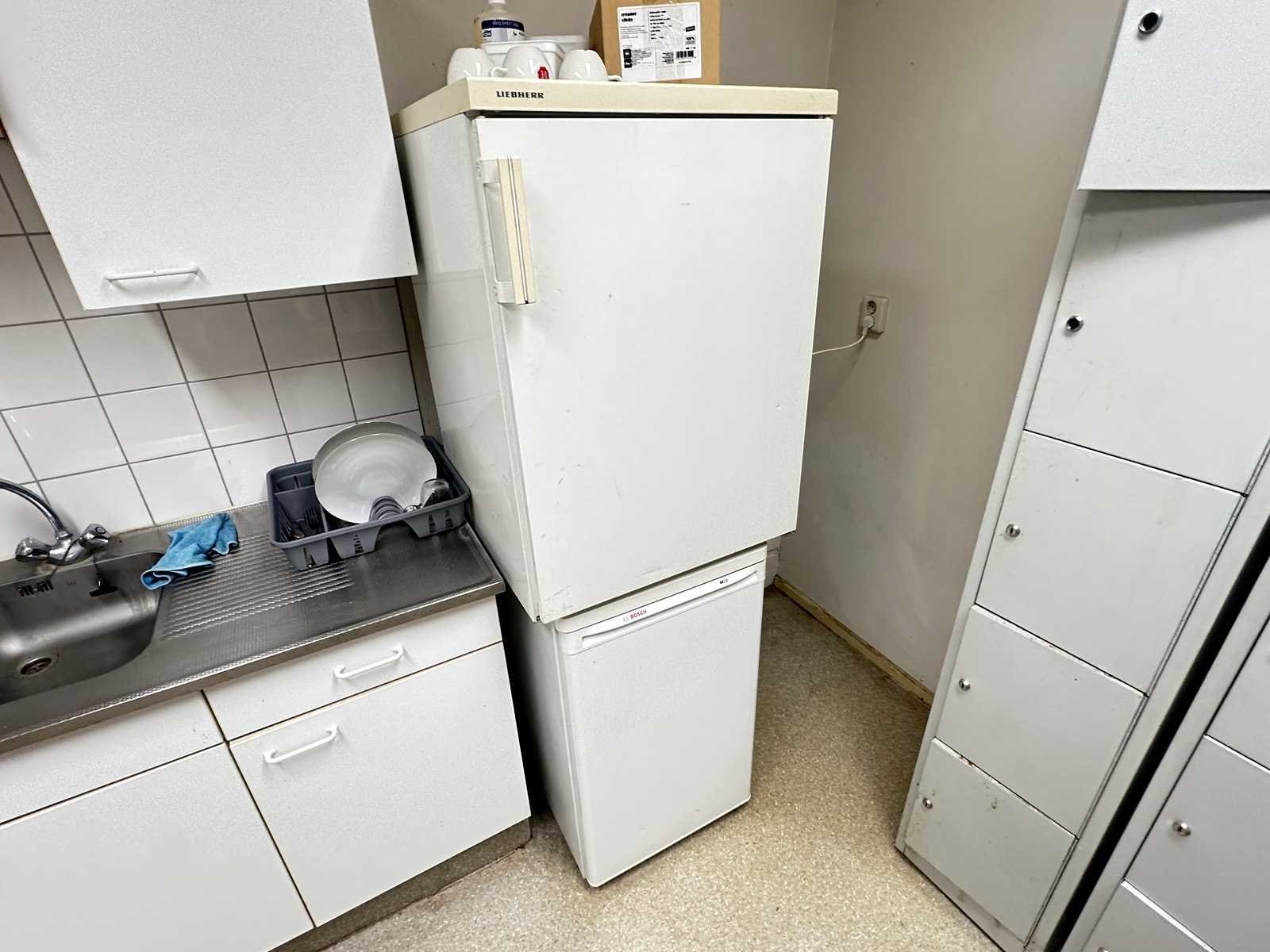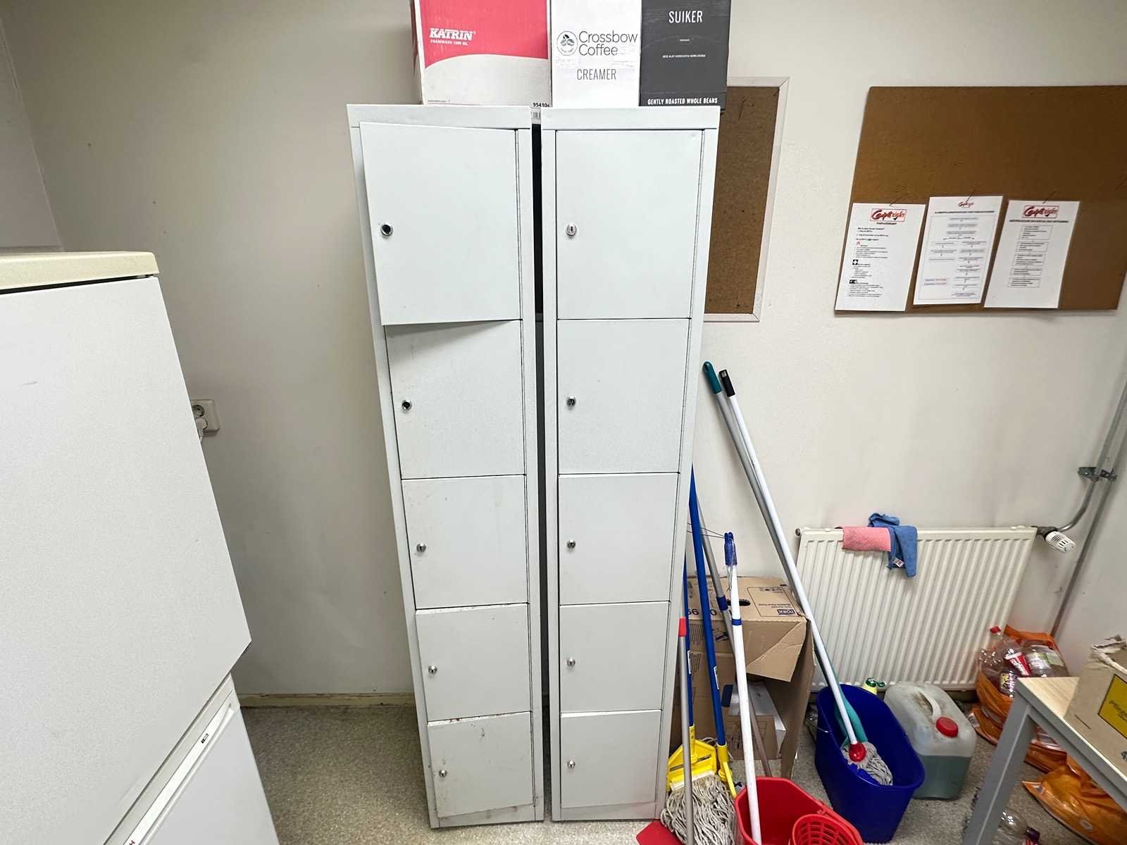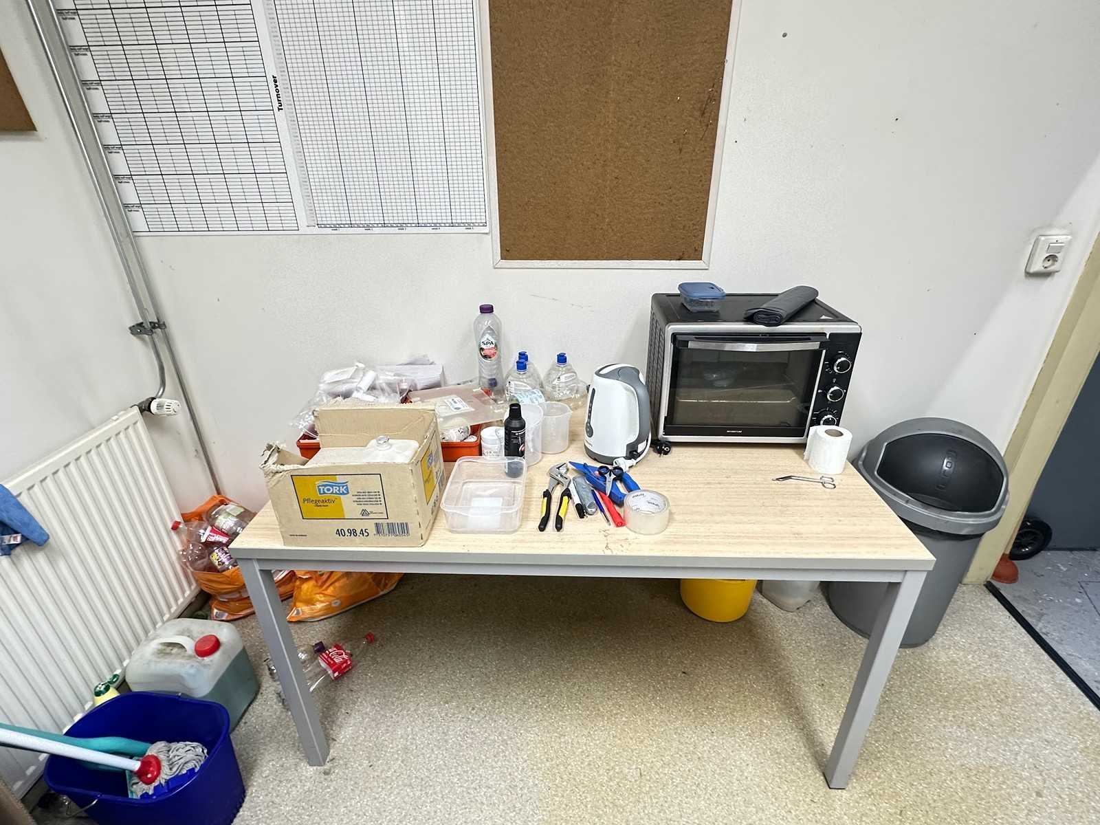 Deze inhoud bestaat uit een koelkast, vriezer, lockerkast, schoonmaakartikelen, magnetron, tafel en verbanddoos.