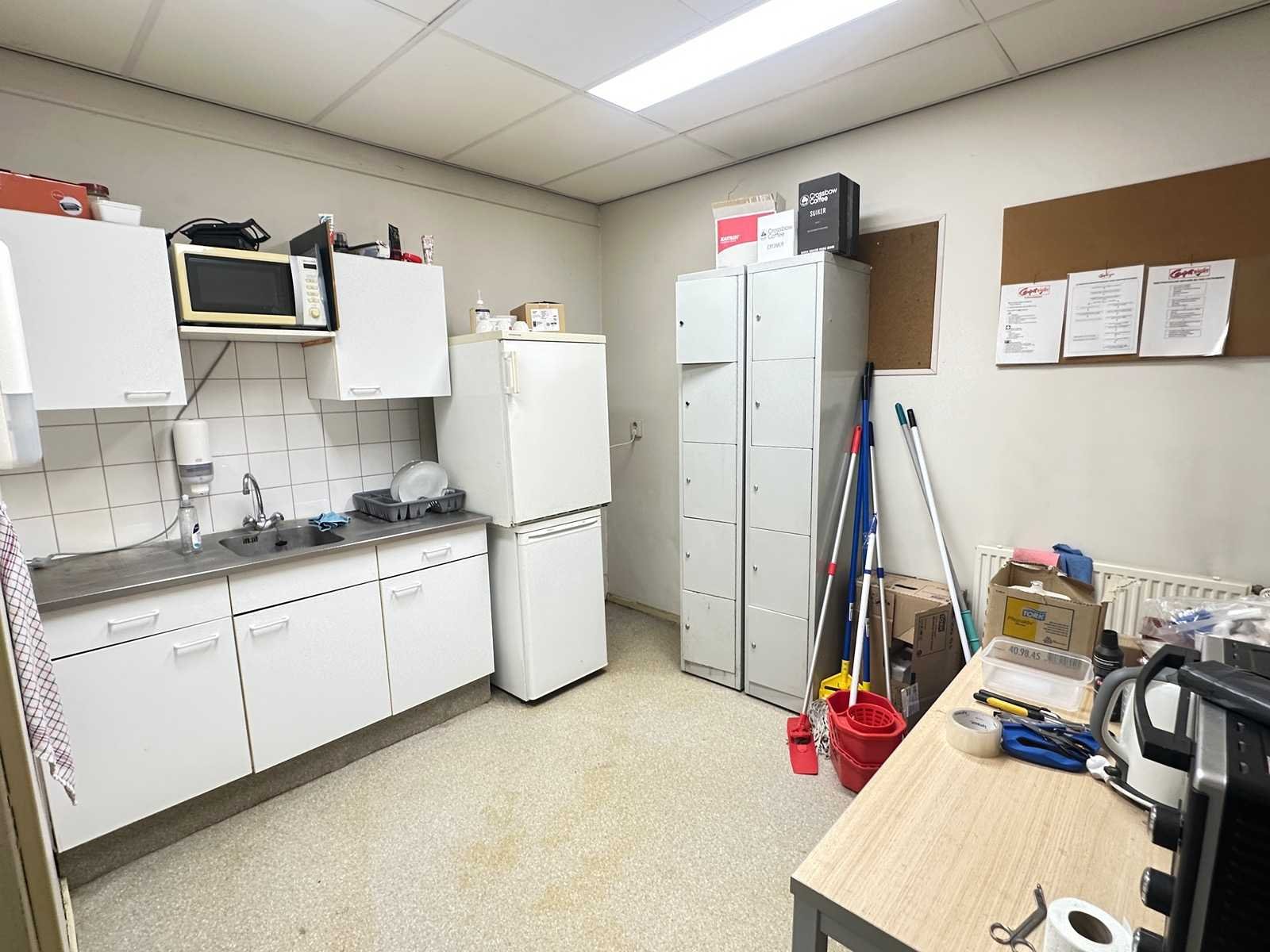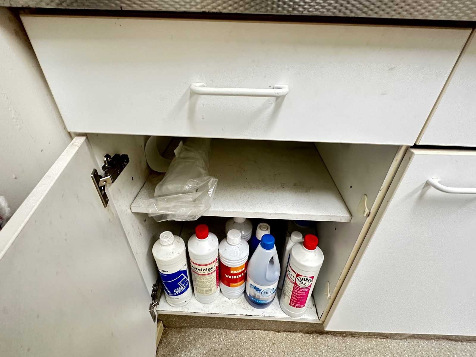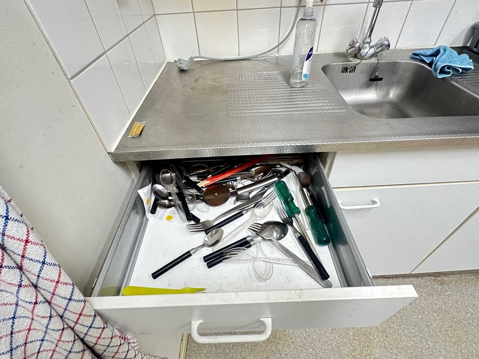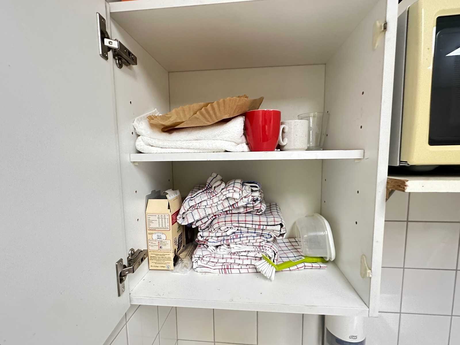 Deze inhoud bestaat uit een koelkast, vriezer, lockerkast, schoonmaakartikelen, magnetron, tafel en verbanddoos.