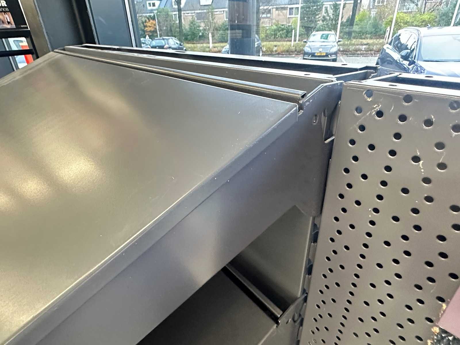 Deze wandstelling wordt verkocht exclusief inhoud. Afmeting l: 2000mm Afmeting b: 600mm Afmeting h: 1440mm Staal: true Aantal legborden: 7