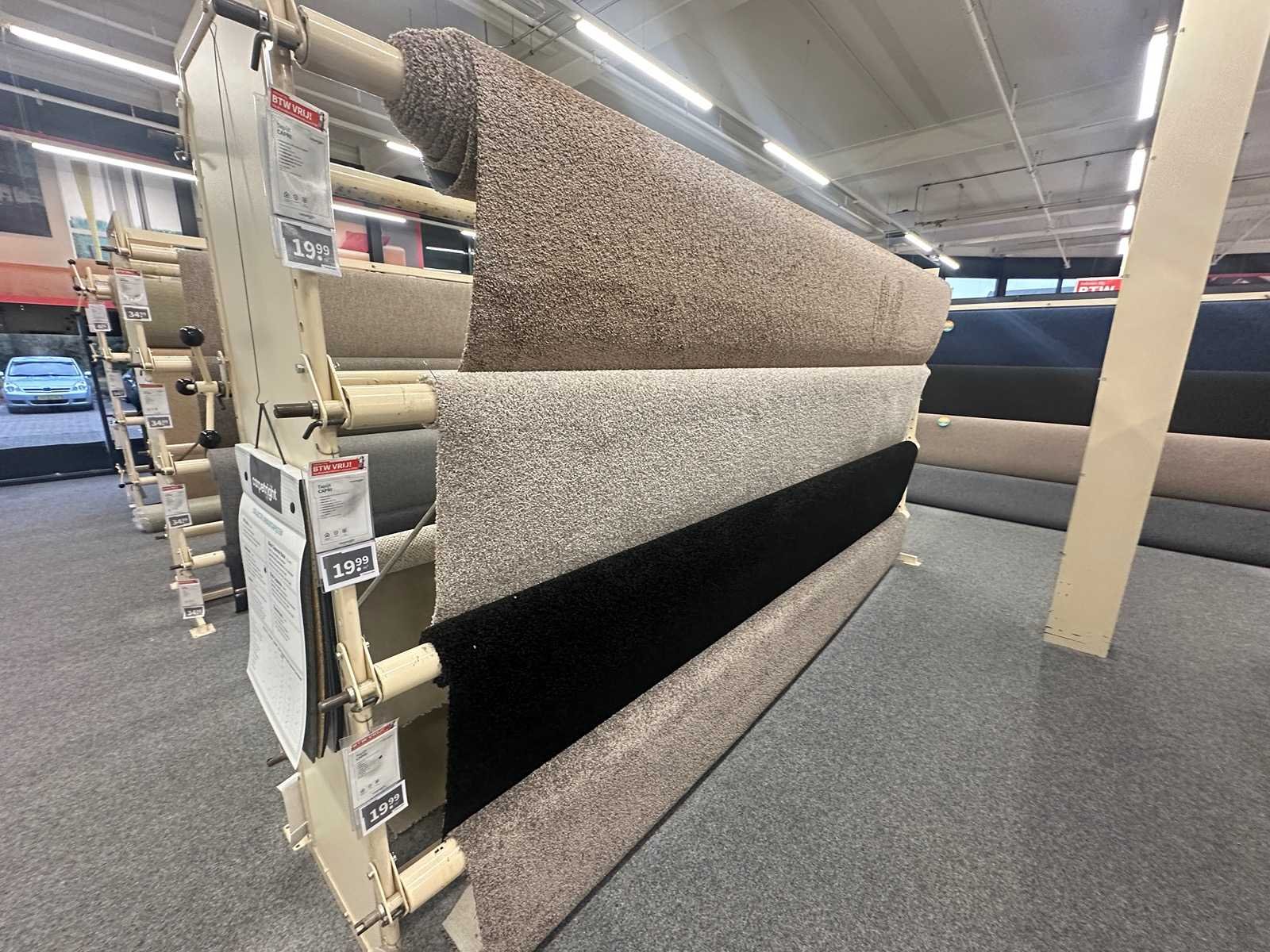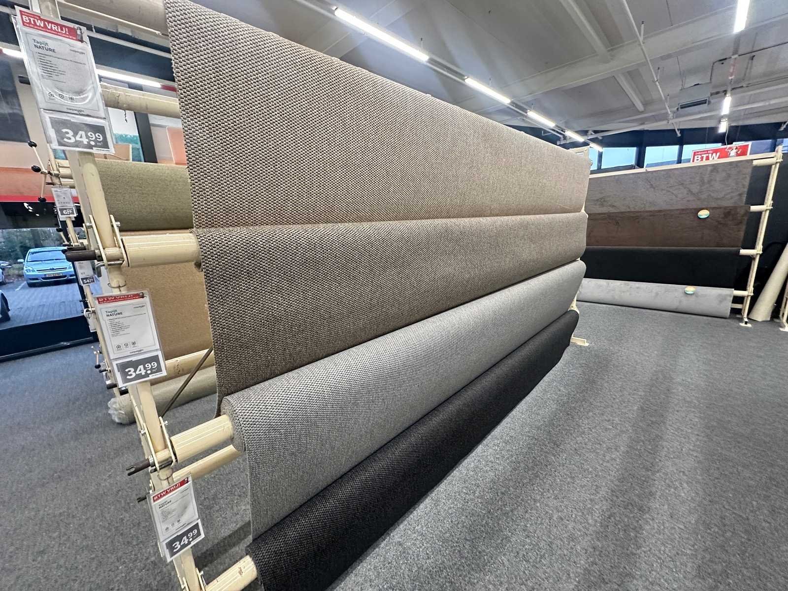 Deze partij bestaat uit diverse soorten vloerbedekking op 13 rekken. Verschillende afmetingen en kleuren. Exclusief rekken.
