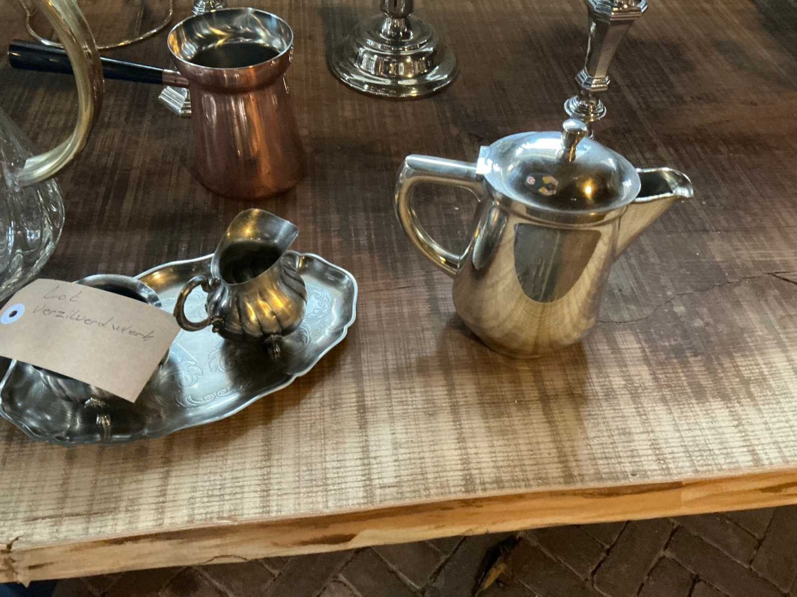 Verzilverd, bestaande uit 3 diverseckandelaars, 4 kannetjes, 1x glazen karaf, schalen, melk en suikerstel