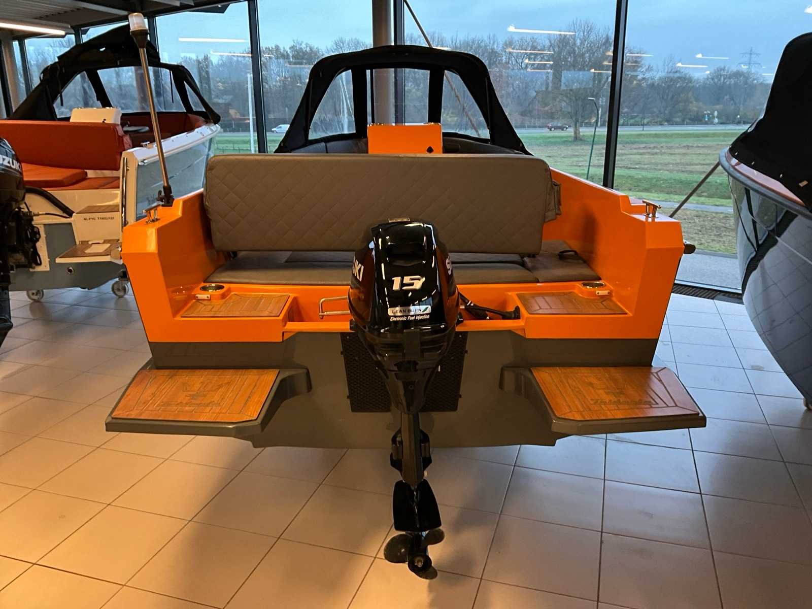Tridente 18 S (grijs-oranje) (DEMO model) Vaarklaar met de volgende opties: – Buiskap kleur zwart – Teakline HPL vloer – Kussens - zonnedek - navigatieverlichting - toplicht - schakelpaneel , 12v en usb – Luxe gashendel - stuurwiel - rvs fenderhaken Merk: Tridente Type: 17 Rompmateriaal: Polyester Brandstof: Benzine Bouwjaar: 2021 Lengte over alles: 5.3m Breedte formaat: 2m Type motor: Suzuki DF15