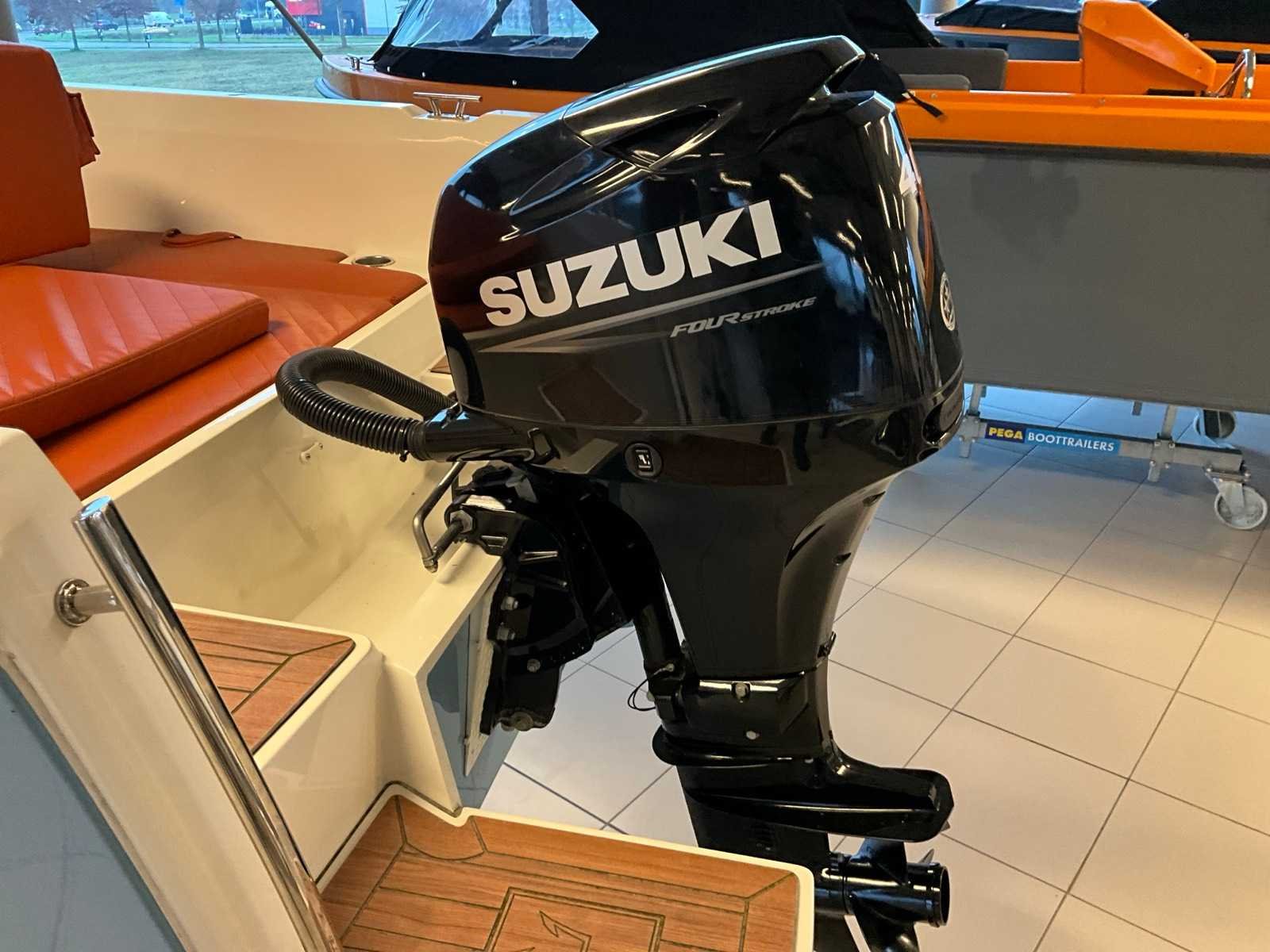 Tridente 18 S ( pastel blauw-wit) Vaarklaar met de volgende opties: – 40pk Suzuki – Buiskap kleur zwart – Teakline HPL vloer – Kussens miami stof blokprofiel (dollaro Orange ) -zonnedek -rvs package -navigatieverlichting -toplicht -schakelpaneel , 12v en usb – Luxe gashendel -stuurwiel -rvs fenderhaken -24L tank Merk: Tridente Type: 18 Rompmateriaal: Polyester Brandstof: Benzine Bouwjaar: 2022 Lengte over alles: 5.6m Breedte formaat: 2.2m Type motor: Suzuki DF40