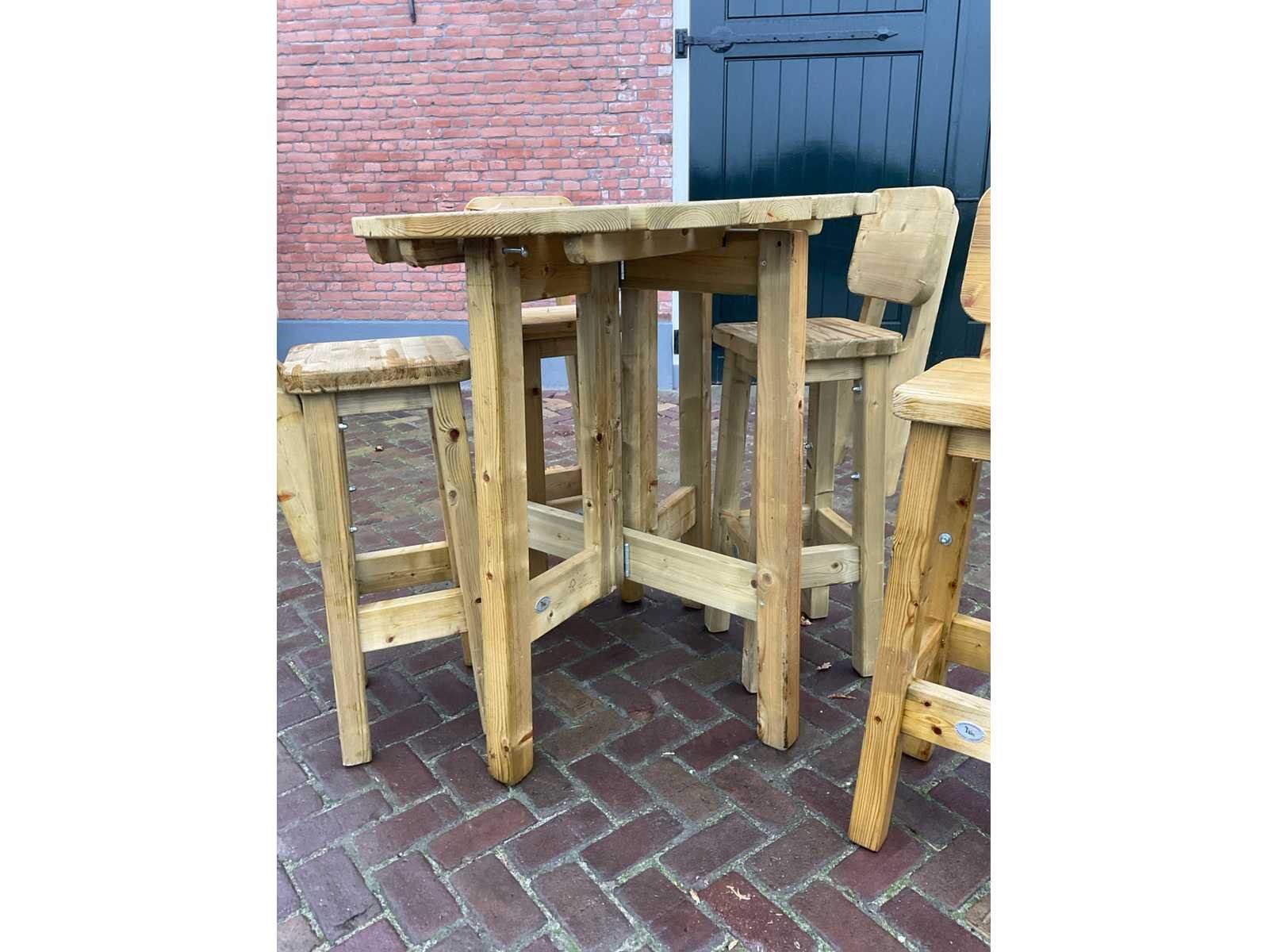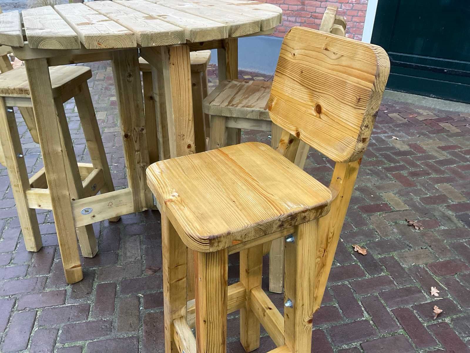 Vurenhout, Bestaande uit: (1x) bartafel Ø 100cm x H 110cm, (4x) Barkrukken, B 34 x D 40 x H 112cm, zithoogte: 83cm. Merk: Talen Hout: true