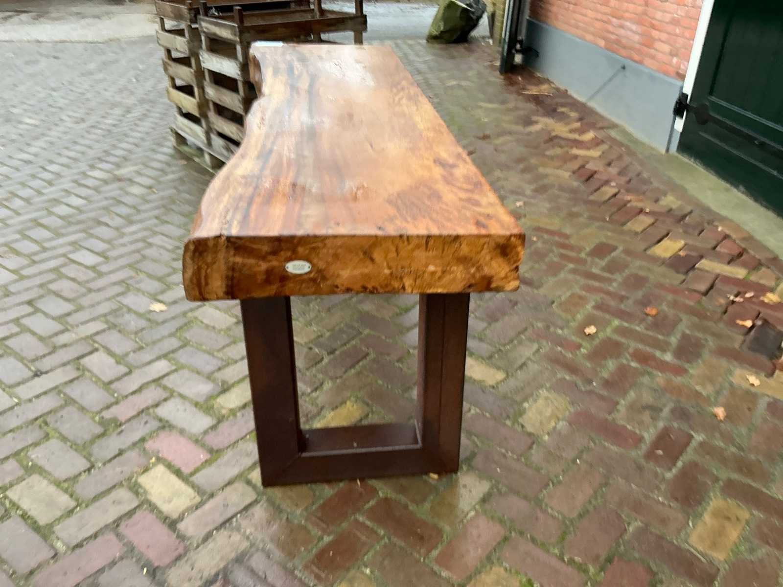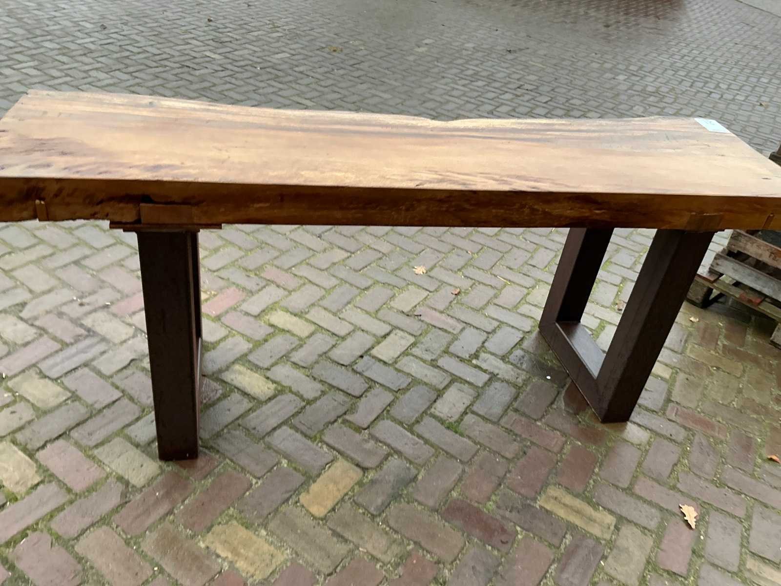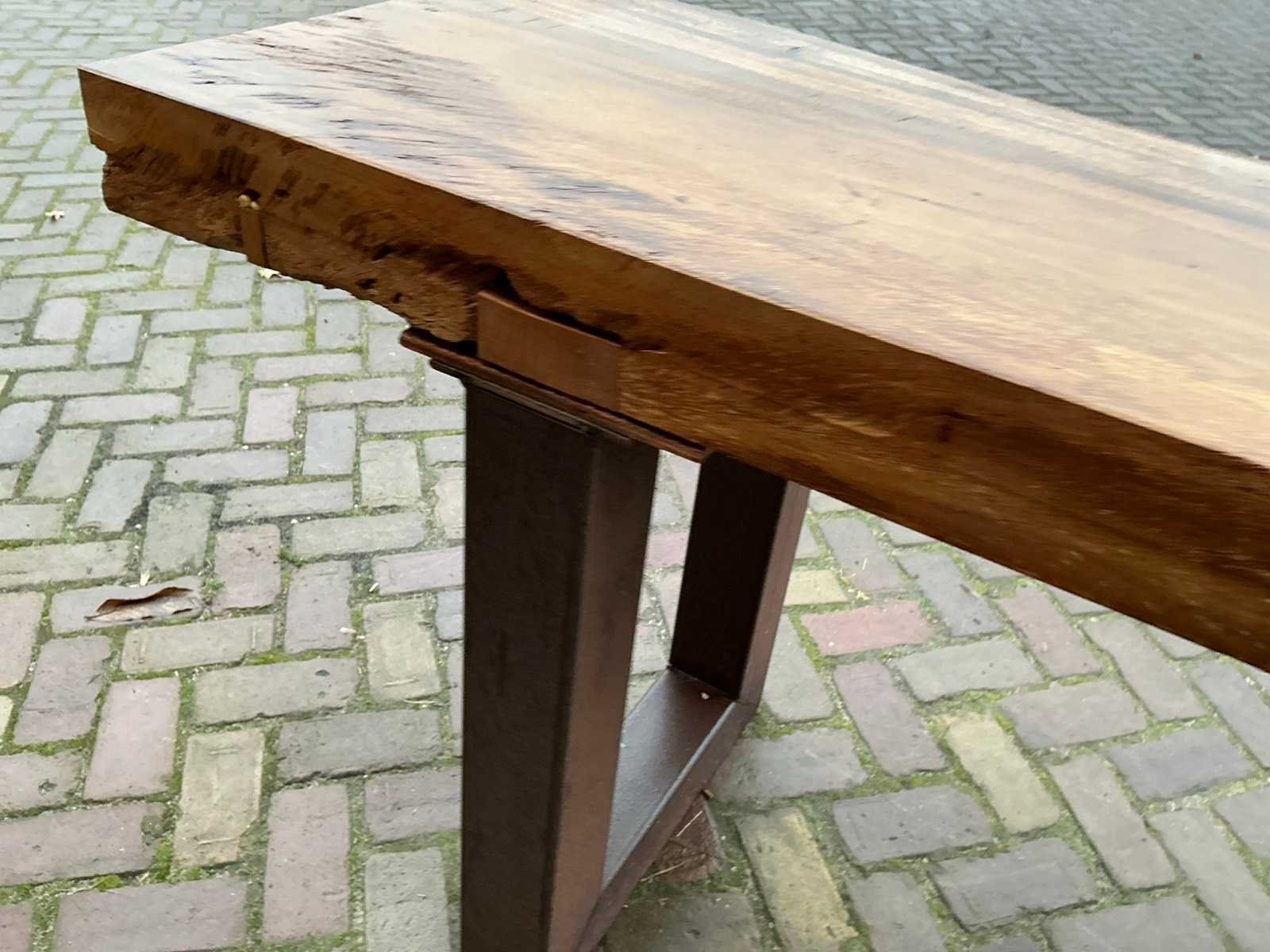 Zithoogte: 70cm, Bladdikte: 10cm. Voorzien van: U-vorm onbehandelde stalen onderstel. Merk: Silvijn Meubels Lengte: 205cm Breedte: 50cm Hoogte: 82cm Materiaal: Hout / Staal