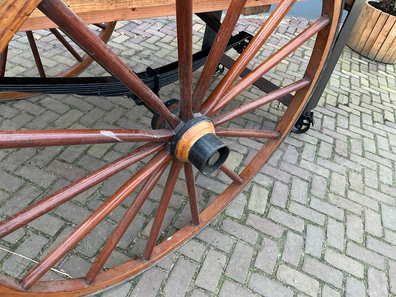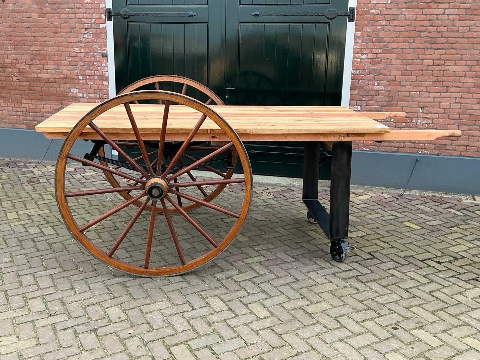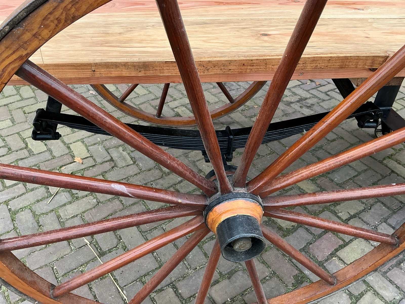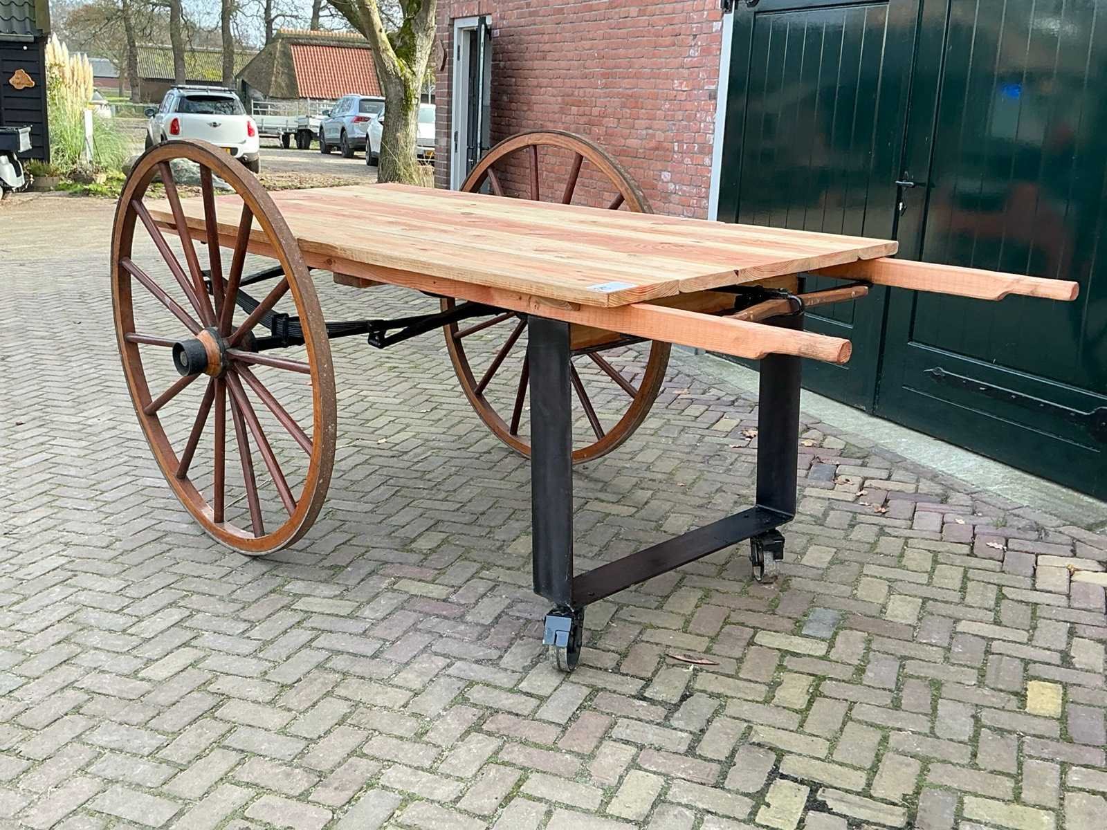 Voorzien van: Koets onderstel, Diameter “JAC met Hugoward” karrewiel: 134cm. Bladformaat: 245x120cm, Bladdikte: 4cm Merk: Jac Met Hugowaard Lengte: 300cm Breedte: 154cm