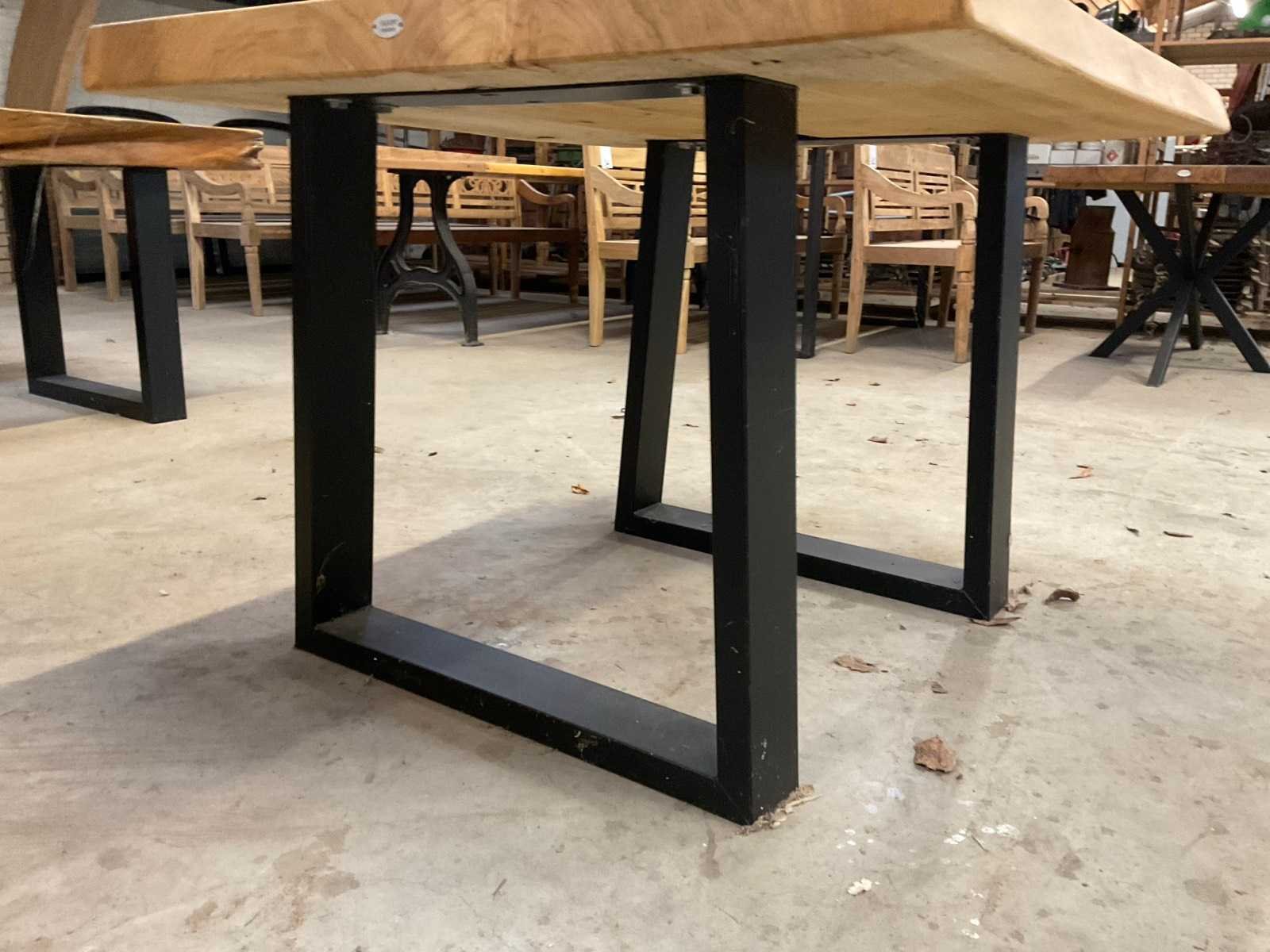 Bladdikte: 6,5cm, Zithoogte: 70cm. Voorzien van: metalen U-frame onderstel. Merk: Silvijn Meubels Vorm: Vierkant Lengte: 105cm Breedte: 105cm Hoogte: 78cm Materiaal: Hout / Metaal