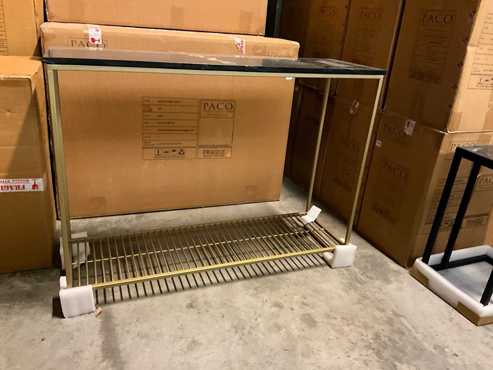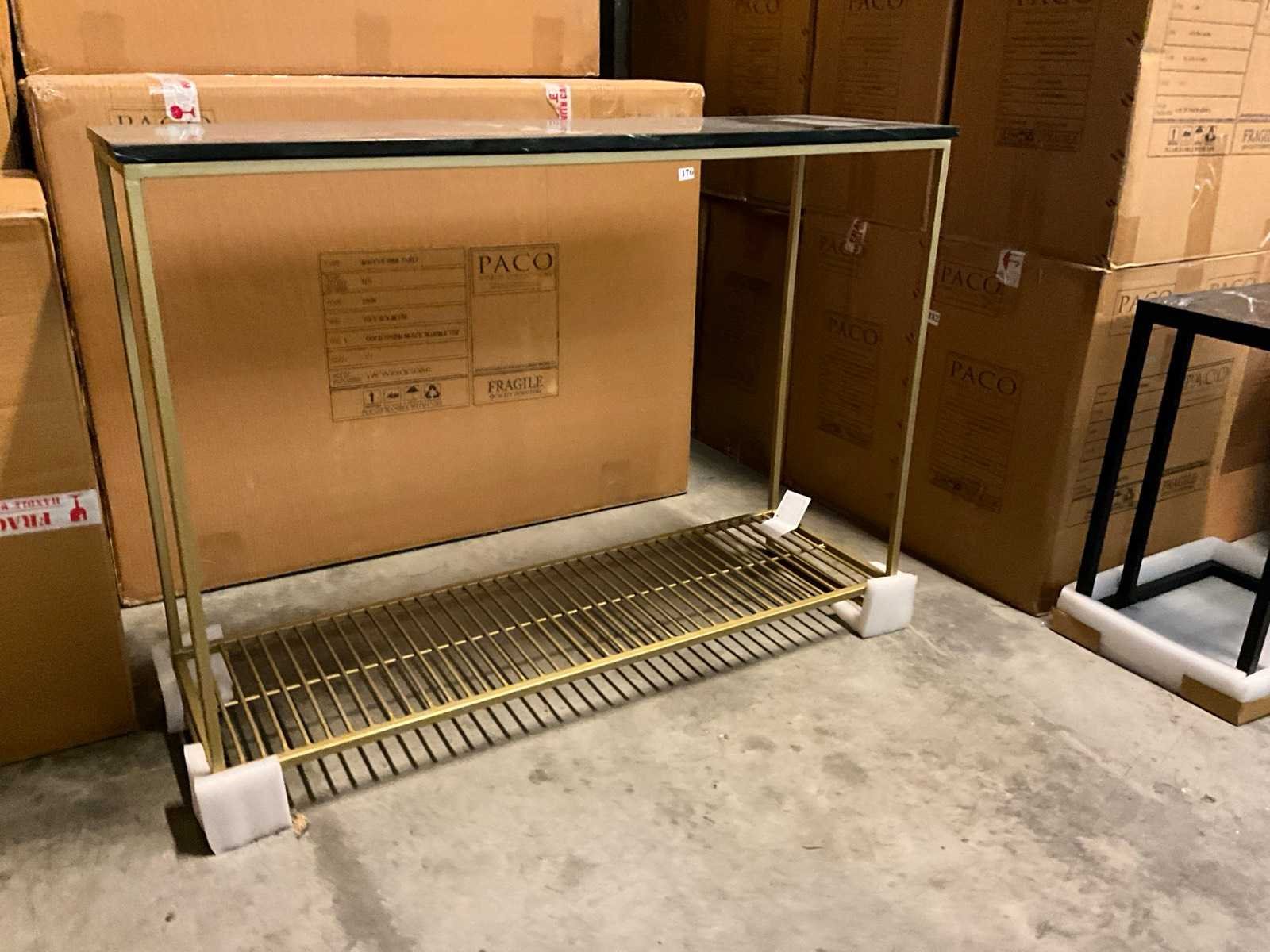 Marmeren blad Goudkleurig stalen onderstel Zware uitvoering Nieuw in doos Model: Boucle Lengte: 110cm Breedte: 35cm Hoogte: 85cm
