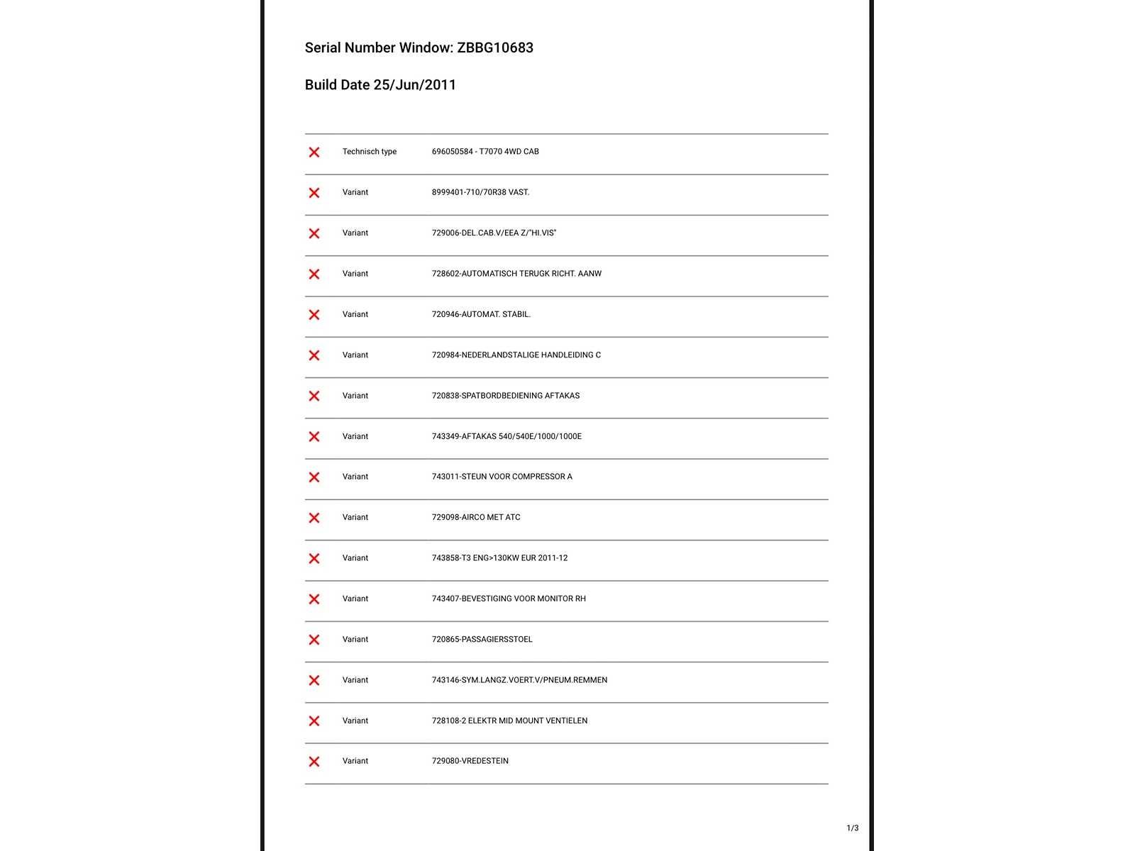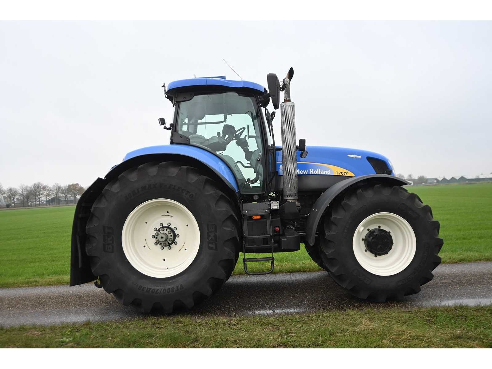 Zonder trekhaak. Voorzien van Zuidberg-fronthef. Bouwjaar: 2011. 120L/min hydr. pomp, joystick Merk: New Holland Type: T7070 Bouwjaar: 2011 Serienummer: ZBBG10683 Kenteken: TSK-29-H Motorvermogen (kW): 165kW Afgelezen urenstand: 16440 Versnellingsbaktype: AutoCommand Aantal hydraulische ventielen voor: 2 Aantal hydraulische ventielen achter: 4 Bandenmaat voor: 600/70R30 Bandenmaat achter: VF800/70R38cfo Fronthefinrichting: true Frontaftakas: true Cabine: true Luchtgeveerde stoel: true Kentekenpapieren compleet?: true Datum eerste toelating: 2011-06-30