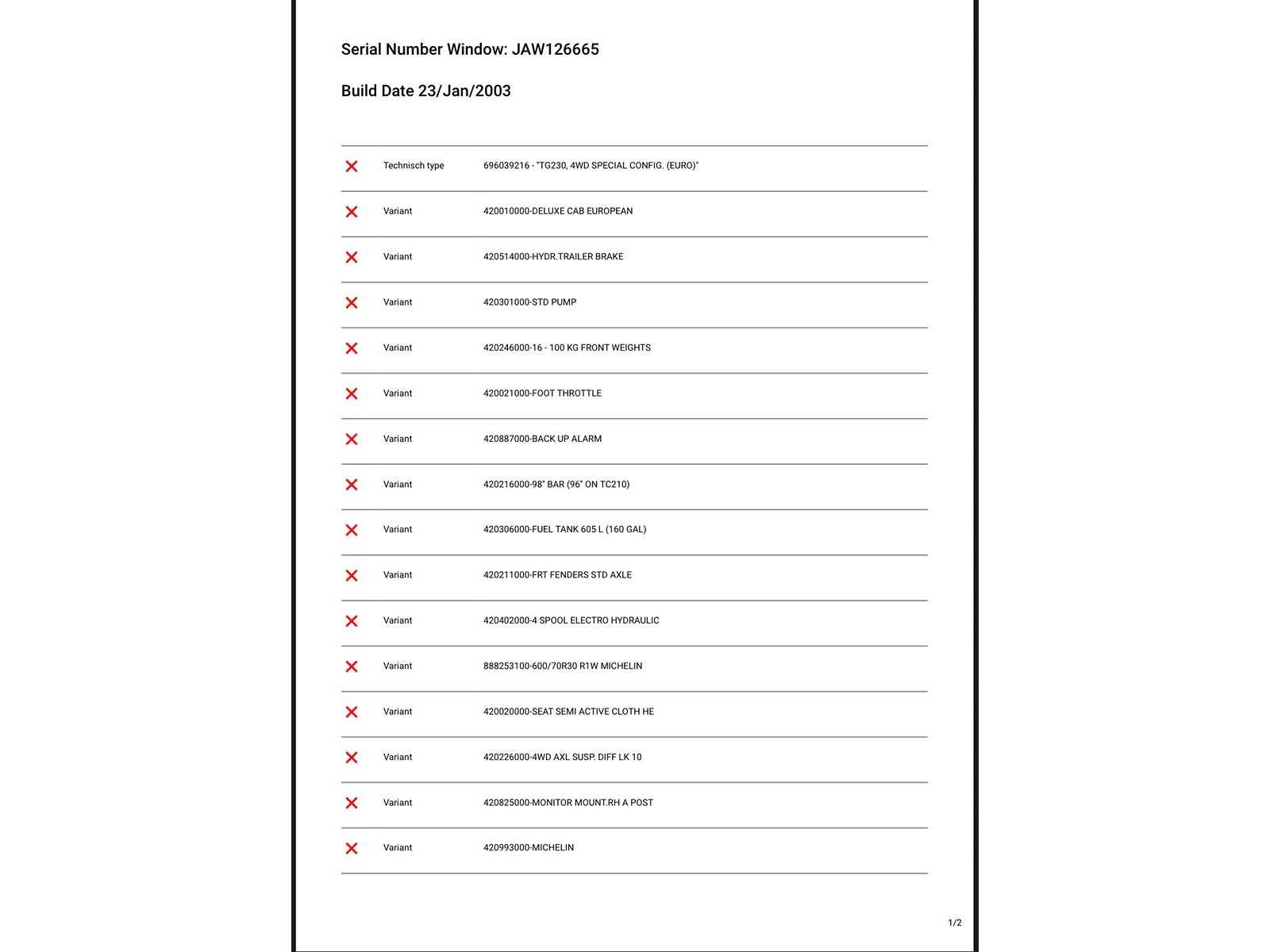 Voorzien van Zuidberg-fronthef. Bouwjaar: 2003. Merk: New Holland Type: TG230 Bouwjaar: 2003 Serienummer: DEG0009015 Kenteken: TTS-41-V Motorvermogen (kW): 2kW Afgelezen urenstand: 13490 Versnellingsbaktype: UltraCommand Aantal hydraulische ventielen achter: 4 Bandenmaat voor: 600/70R30 Bandenmaat achter: 710/70R42 Fronthefinrichting: true Cabine: true Kentekenpapieren compleet?: true Chassisnummer: JAW126665 Datum eerste toelating: 2004-01-23
