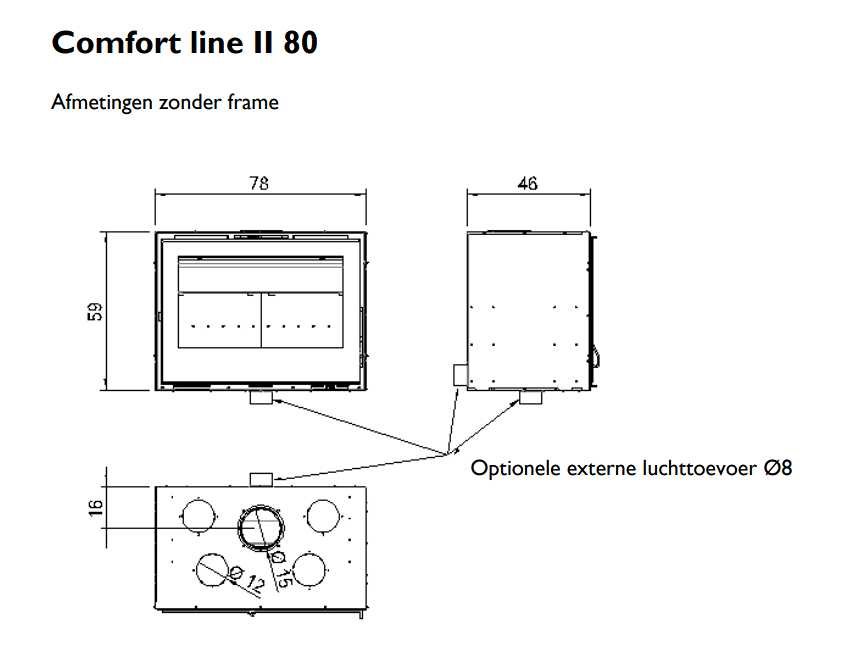 Rookgasafvoer materiaal op locatie verkrijgbaar. Offerte voor installatie mogelijk. Merk: SAEY Type: Comfort Line II 80 Rendement: 85% Vuurzicht: Front Rookgasaansluiting: 150mm Bovenaansluiting: true Vermogen: 9,5kW Totale afmeting lxbxh: 590x780x460mm Inbouw: true Eigen gewicht: 112kg