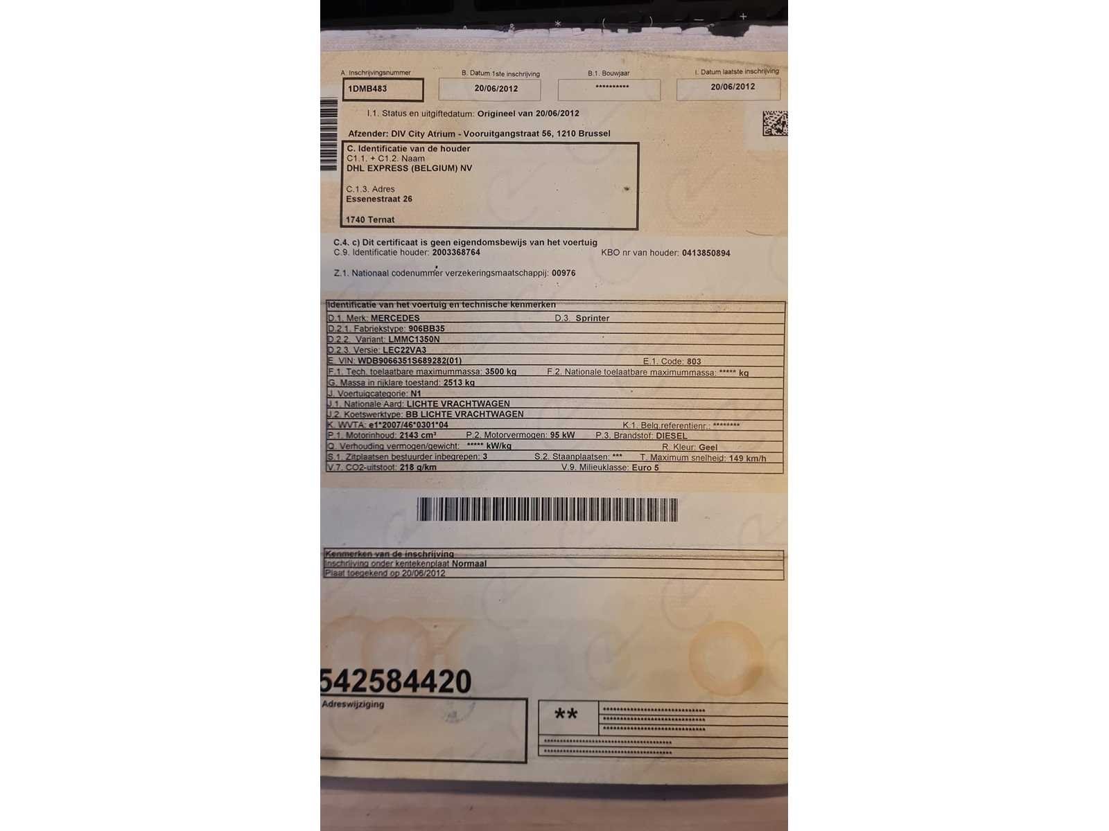 Merk: Mercedes benz Type: Sprinter Model: 313cdi Bouwjaar: 2012 Chassisnummer: WDB9066351S689282 Afgelezen kilometerstand: 471162km Vermogen (kW): 95kW Brandstof: diesel Datum eerste toelating: 20-06-2012 Aantal sleutels: 1 Startinformatie: start en rijdt