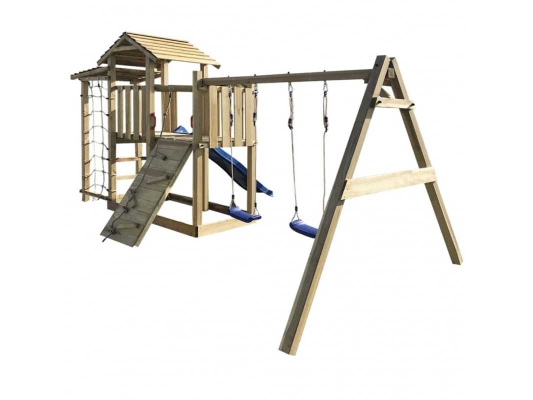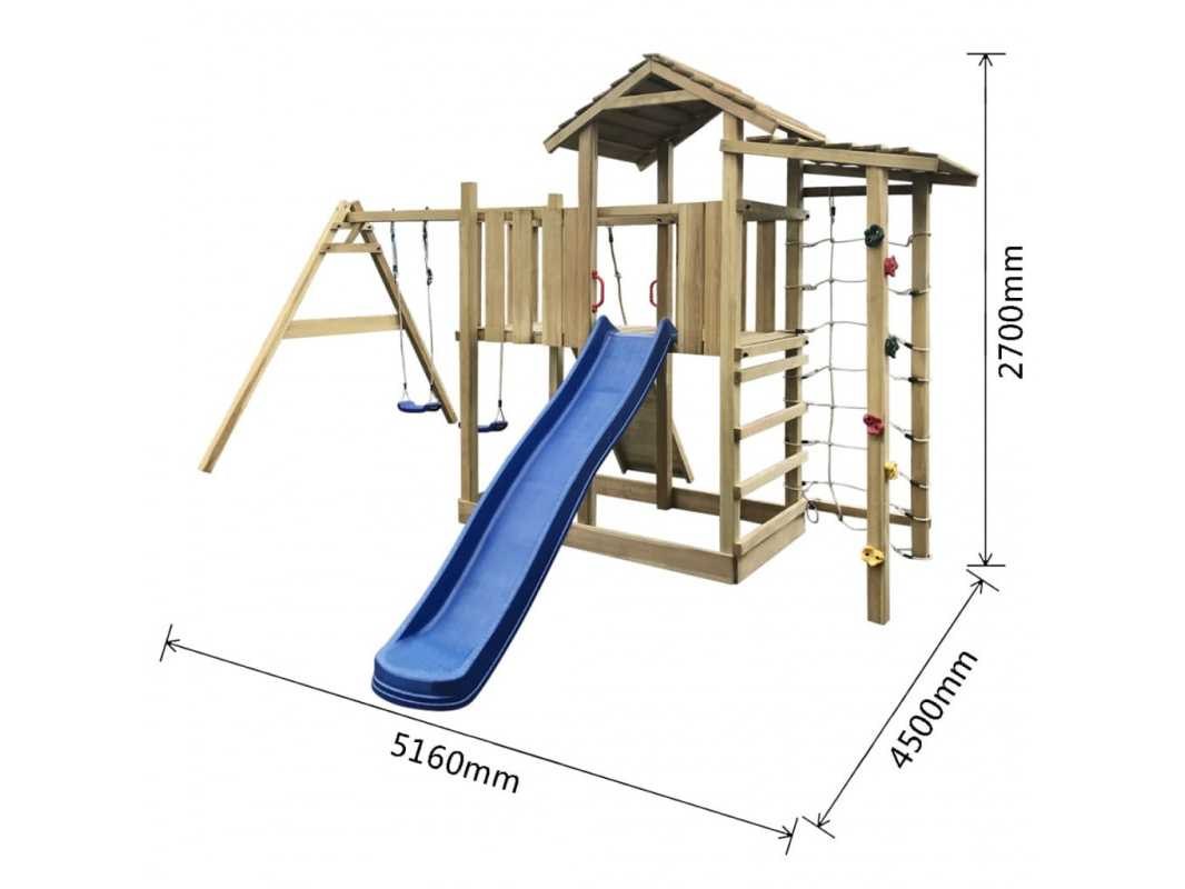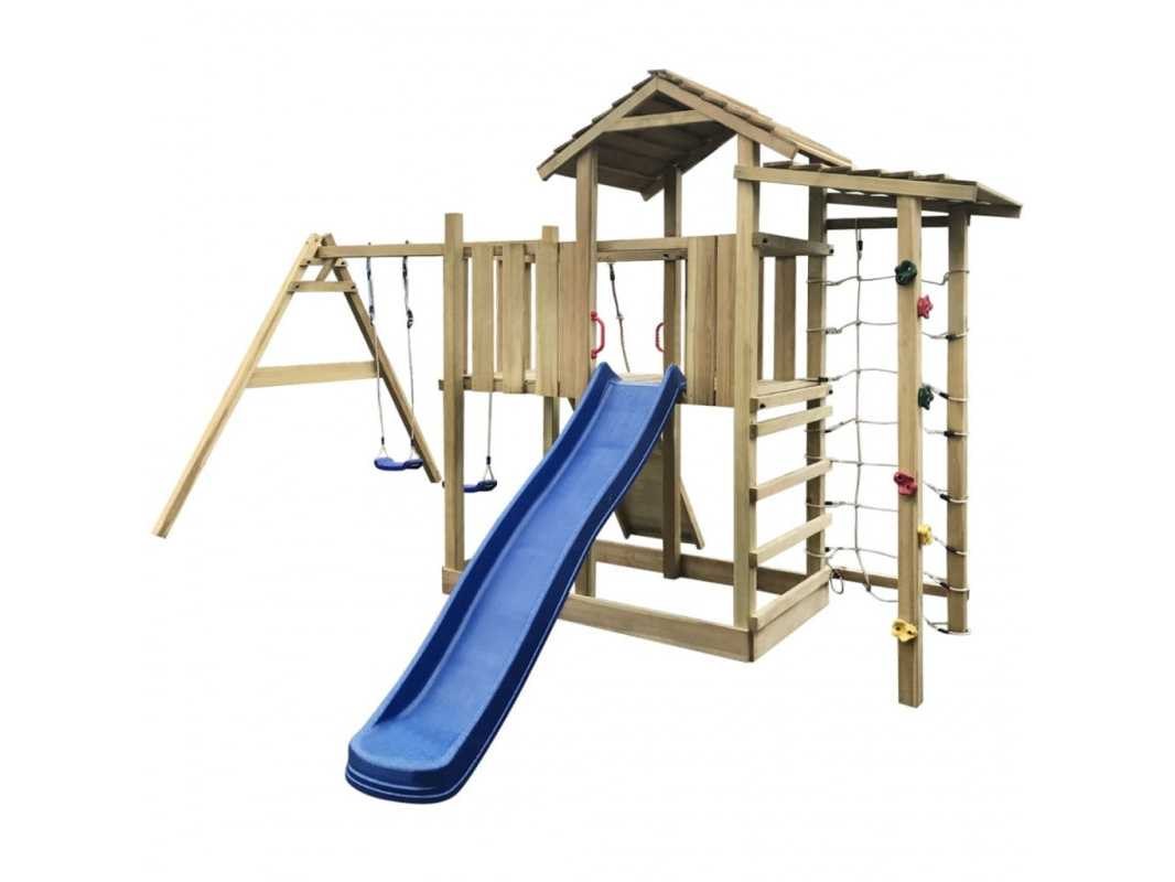 Geleverd met bevestigingsmateriaal en handleidingen incl. Glijbaan met schommels klimnet en klimstenen. Let op ! Dit is een retour pallet pakket ligt verkleurt zie foto. Gewicht: 275kg Lengte: 353cm Breedte: 390cm Hoogte: 268cm Materiaal: Grenen geimpregneerd