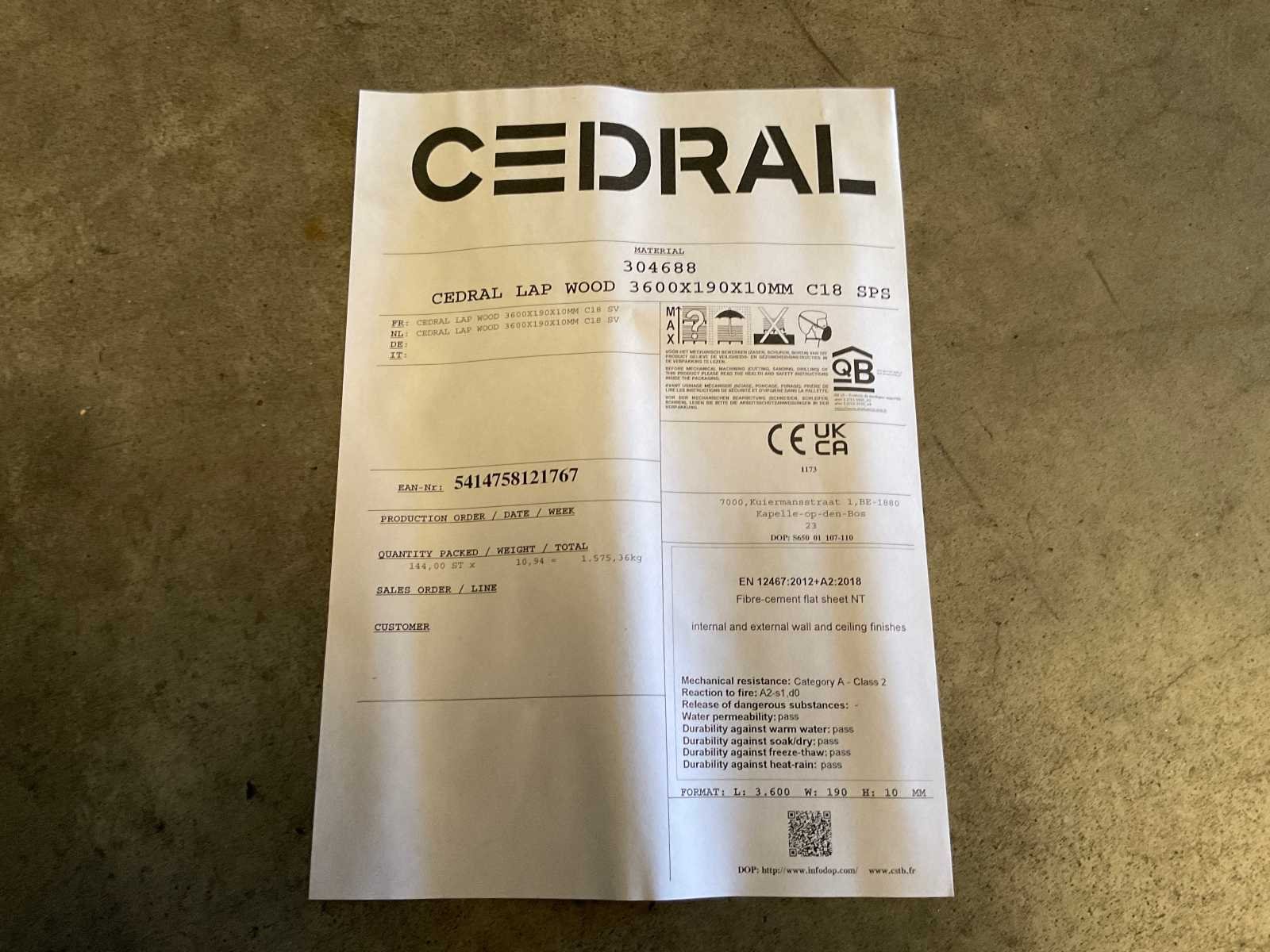 Technische specificaties: Gewicht per gevelstrook: 11.20 kg Brandklasse: A2-s1,d0 Afmetingen pakket: 360x116x36cm, 1.615 kg Merk: Cedral Model: Lap Wood Kleur: Leisteengrijs Gewicht: 11.2kg Lengte: 360cm Breedte: 19cm Hoogte: 1cm Materiaal: Cementvezel
