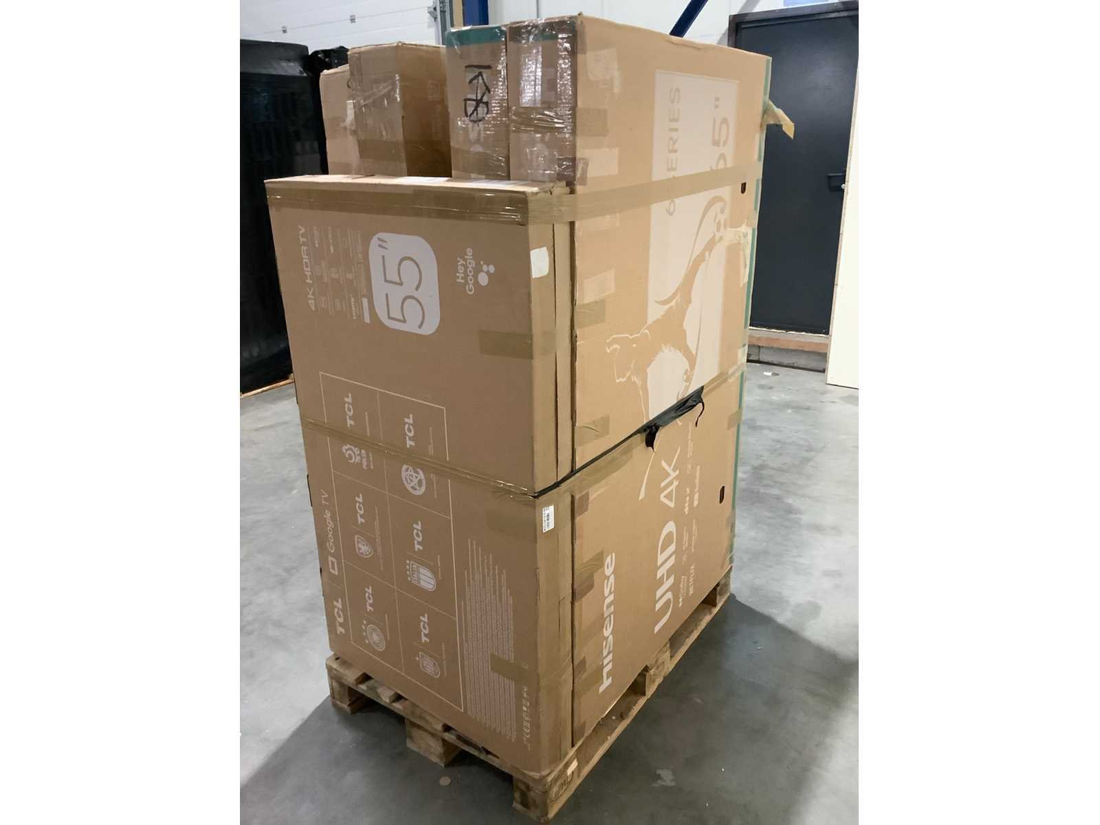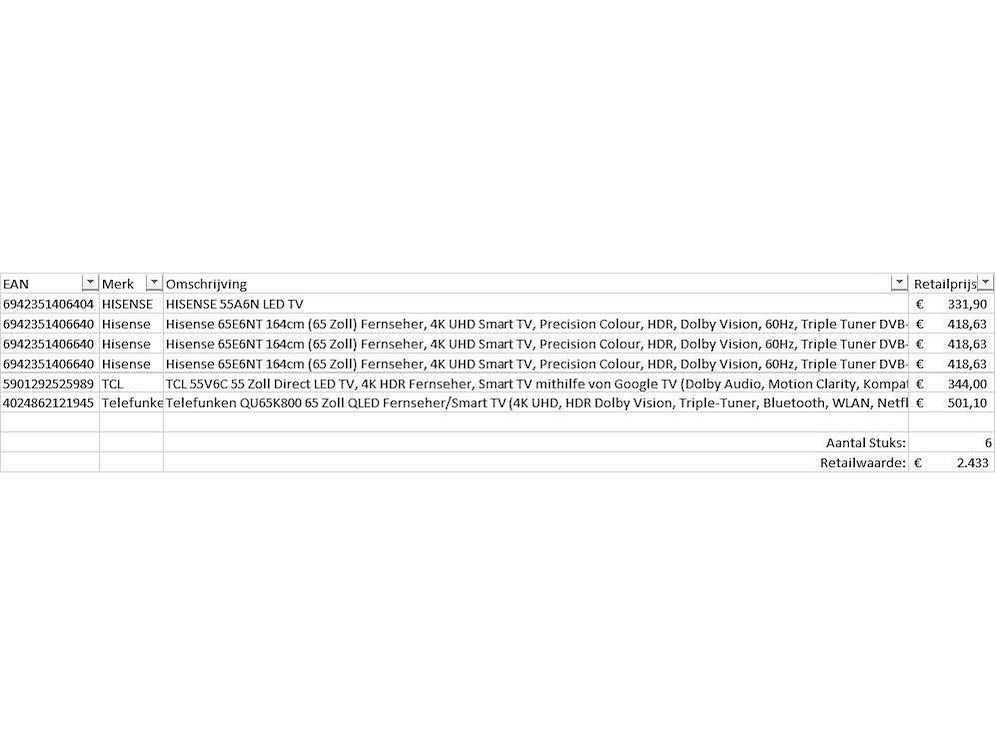 Dit betreft een partij televisies retourgoederen van een grote online retailer. De partij bestaat uit diverse diverse maten televisies. Aantal stuks: 6. Retailwaarde: €2433,- De televisies zijn niet werkend en zijn te gebruiken voor onderdelen. Kom op de kijkdag om te om zo een goed beeld te krijgen van de reden van retour. Zie foto's voor lijst met inhoud. Bezorgtermijn 14 dagen Merk: Pallet Retourgoederen - Televisies