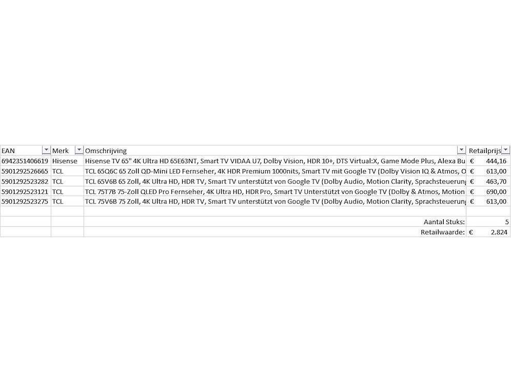 Dit betreft een partij televisies retourgoederen van een grote online retailer. De partij bestaat uit diverse diverse maten televisies. Aantal stuks: 5. Retailwaarde: €2824,- De televisies zijn niet werkend en zijn te gebruiken voor onderdelen. Kom op de kijkdag om te om zo een goed beeld te krijgen van de reden van retour. Zie foto's voor lijst met inhoud. Bezorgtermijn 14 dagen Merk: Pallet Retourgoederen - Televisies