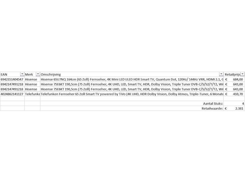 Dit betreft een partij televisies retourgoederen van een grote online retailer. De partij bestaat uit diverse diverse maten televisies. Aantal stuks: 4. Retailwaarde: €2381,- De televisies zijn niet werkend en zijn te gebruiken voor onderdelen. Kom op de kijkdag om te om zo een goed beeld te krijgen van de reden van retour. Zie foto's voor lijst met inhoud. Bezorgtermijn 14 dagen Merk: Pallet Retourgoederen - Televisies