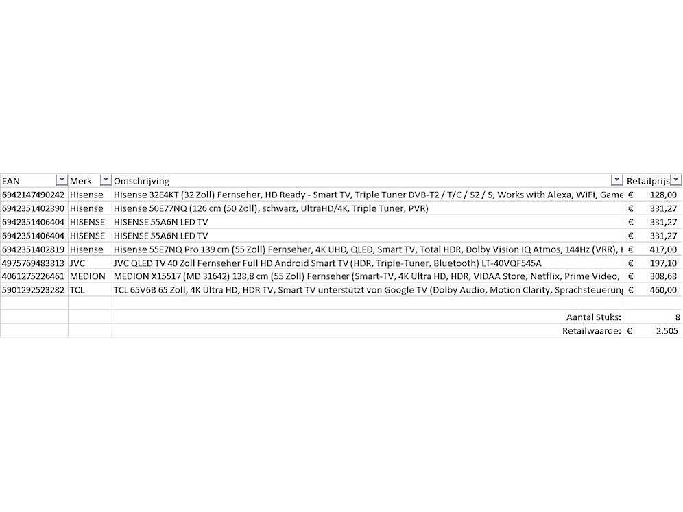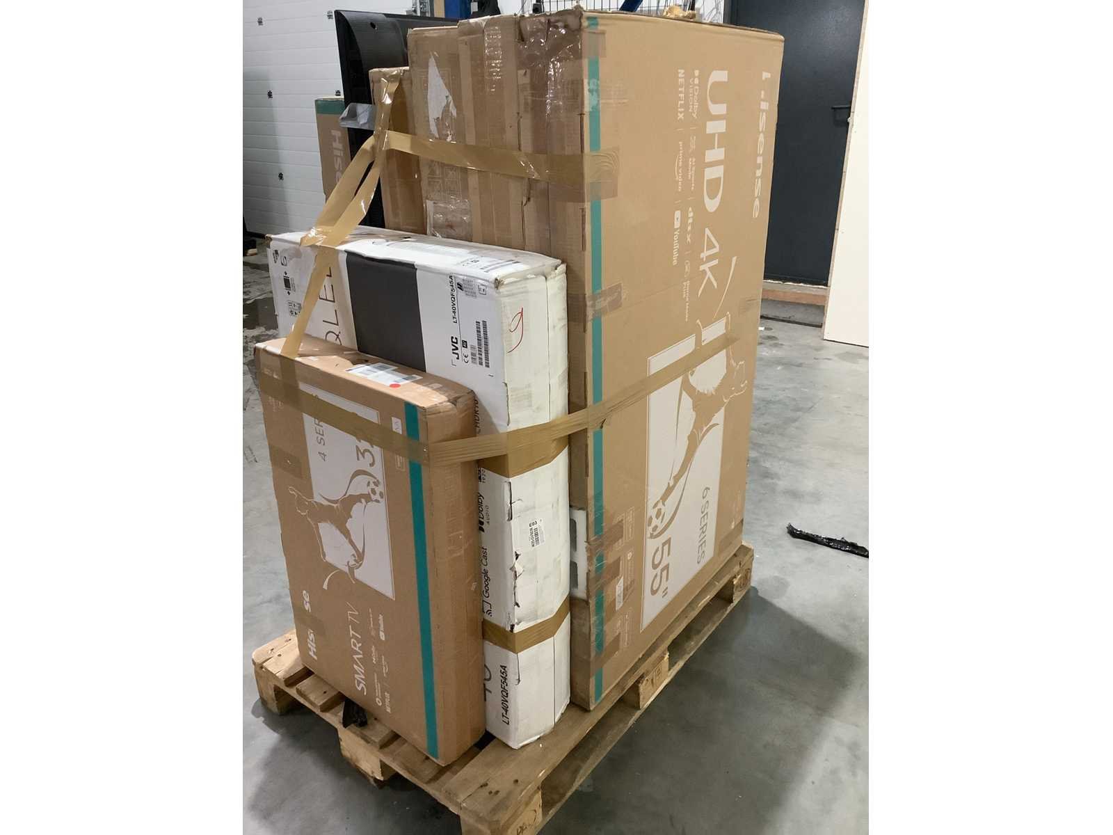 Dit betreft een partij televisies retourgoederen van een grote online retailer. De partij bestaat uit diverse diverse maten televisies. Aantal stuks: 8. Retailwaarde: €2505,- De televisies zijn niet werkend en zijn te gebruiken voor onderdelen. Kom op de kijkdag om te om zo een goed beeld te krijgen van de reden van retour. Zie foto's voor lijst met inhoud. Bezorgtermijn 14 dagen Merk: Pallet Retourgoederen - Televisies