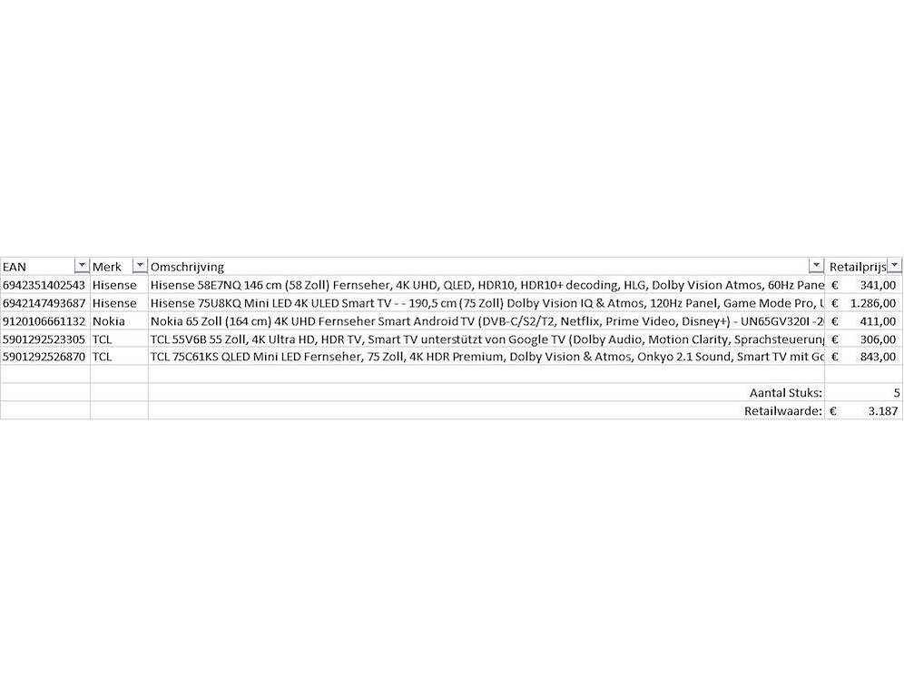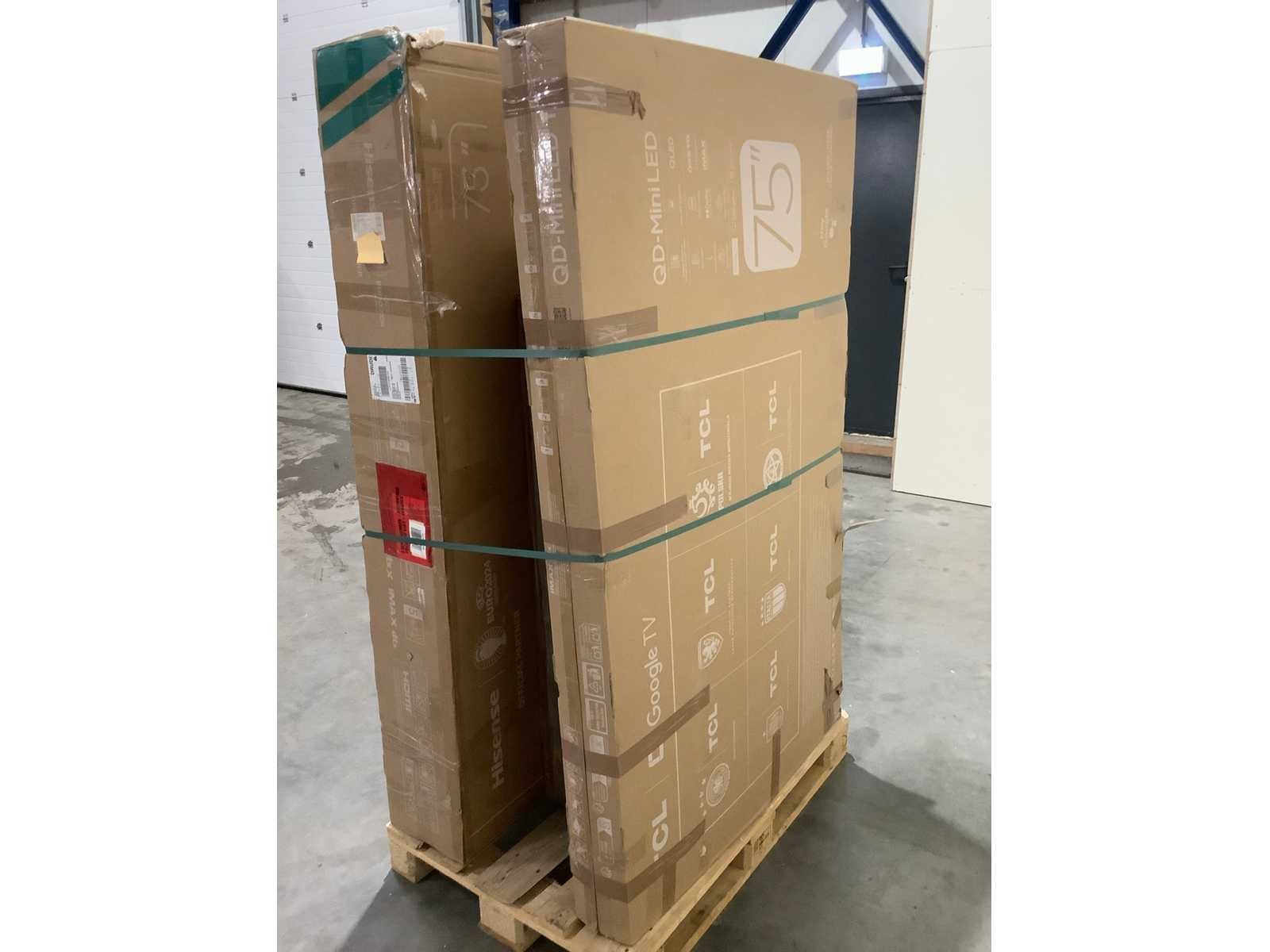 Dit betreft een partij televisies retourgoederen van een grote online retailer. De partij bestaat uit diverse diverse maten televisies. Aantal stuks: 5. Retailwaarde: €3187,- De televisies zijn niet werkend en zijn te gebruiken voor onderdelen. Kom op de kijkdag om te om zo een goed beeld te krijgen van de reden van retour. Zie foto's voor lijst met inhoud. Bezorgtermijn 14 dagen Merk: Pallet Retourgoederen - Televisies