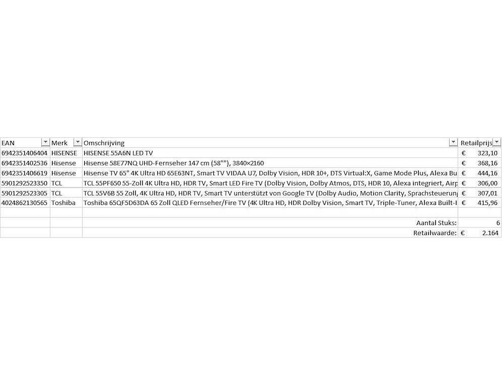 Dit betreft een partij televisies retourgoederen van een grote online retailer. De partij bestaat uit diverse diverse maten televisies. Aantal stuks: 6. Retailwaarde: €2164,- De televisies zijn niet werkend en zijn te gebruiken voor onderdelen. Kom op de kijkdag om te om zo een goed beeld te krijgen van de reden van retour. Zie foto's voor lijst met inhoud. Bezorgtermijn 14 dagen Merk: Pallet Retourgoederen - Televisies