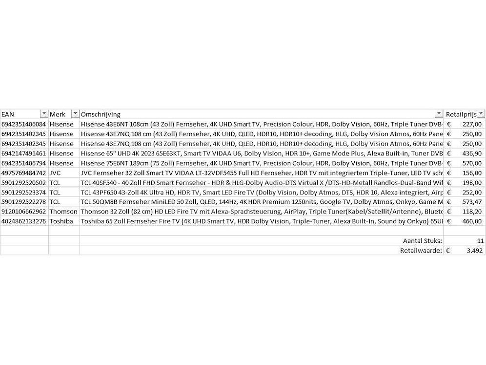 Dit betreft een partij televisies retourgoederen van een grote online retailer. De partij bestaat uit diverse diverse maten televisies. Aantal stuks: 11. Retailwaarde: €3492,- De televisies zijn niet werkend en zijn te gebruiken voor onderdelen. Kom op de kijkdag om te om zo een goed beeld te krijgen van de reden van retour. Zie foto's voor lijst met inhoud. Bezorgtermijn 14 dagen Merk: Pallet Retourgoederen - Televisies