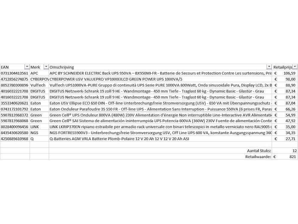 Dit betreft een partij noodstroomvoorzieningen van een grote online retailer. De partij bestaat uit diverse soorten noodstroom voorzieningen waaronder back ups, power stations etc. Aantal stuks: 12. Retailwaarde: €821,- Ongecontroleerd: werking onbekend (mix van werkend, incompleet, beschadigd, te gebruiken voor onderdelen). Kom op de kijkdag om te om zo een goed beeld te krijgen van de reden van retour. Zie foto's voor lijst met inhoud. Bezorgtermijn 14 dagen Merk: Pallet Retourgoederen - Noodstroom voorzieningen