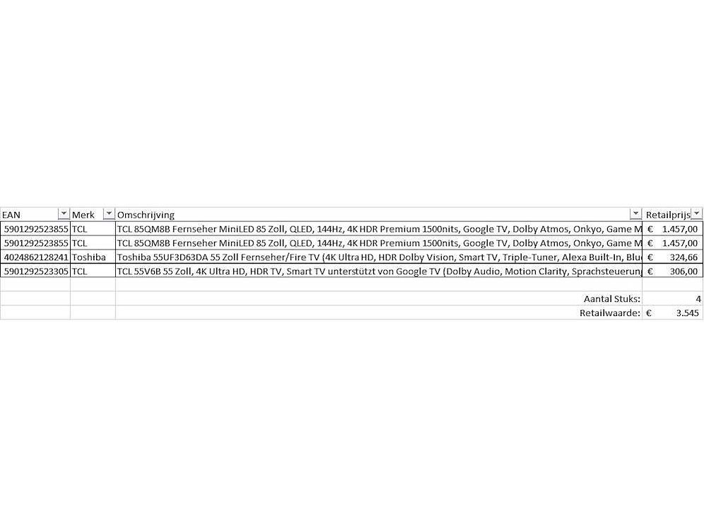 Dit betreft een partij televisies retourgoederen van een grote online retailer. De partij bestaat uit diverse diverse maten televisies. Aantal stuks: . Retailwaarde: De televisies zijn niet werkend en zijn te gebruiken voor onderdelen. Kom op de kijkdag om te om zo een goed beeld te krijgen van de reden van retour. Zie foto's voor lijst met inhoud. Merk: Pallet Retourgoederen