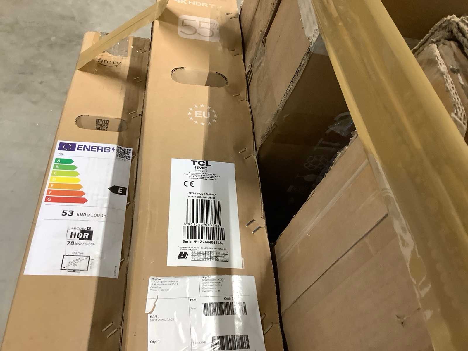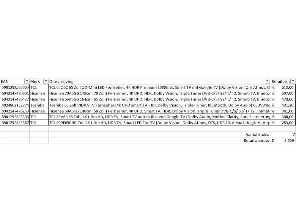 Dit betreft een partij televisies retourgoederen van een grote online retailer. De partij bestaat uit diverse diverse maten televisies. Aantal stuks: . Retailwaarde: De televisies zijn niet werkend en zijn te gebruiken voor onderdelen. Kom op de kijkdag om te om zo een goed beeld te krijgen van de reden van retour. Zie foto's voor lijst met inhoud. Merk: Pallet Retourgoederen