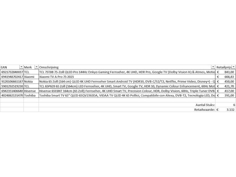 Dit betreft een partij televisies retourgoederen van een grote online retailer. De partij bestaat uit diverse diverse maten televisies. Aantal stuks: . Retailwaarde: De televisies zijn niet werkend en zijn te gebruiken voor onderdelen. Kom op de kijkdag om te om zo een goed beeld te krijgen van de reden van retour. Zie foto's voor lijst met inhoud. Merk: Pallet Retourgoederen