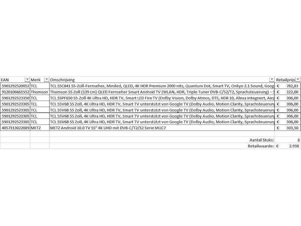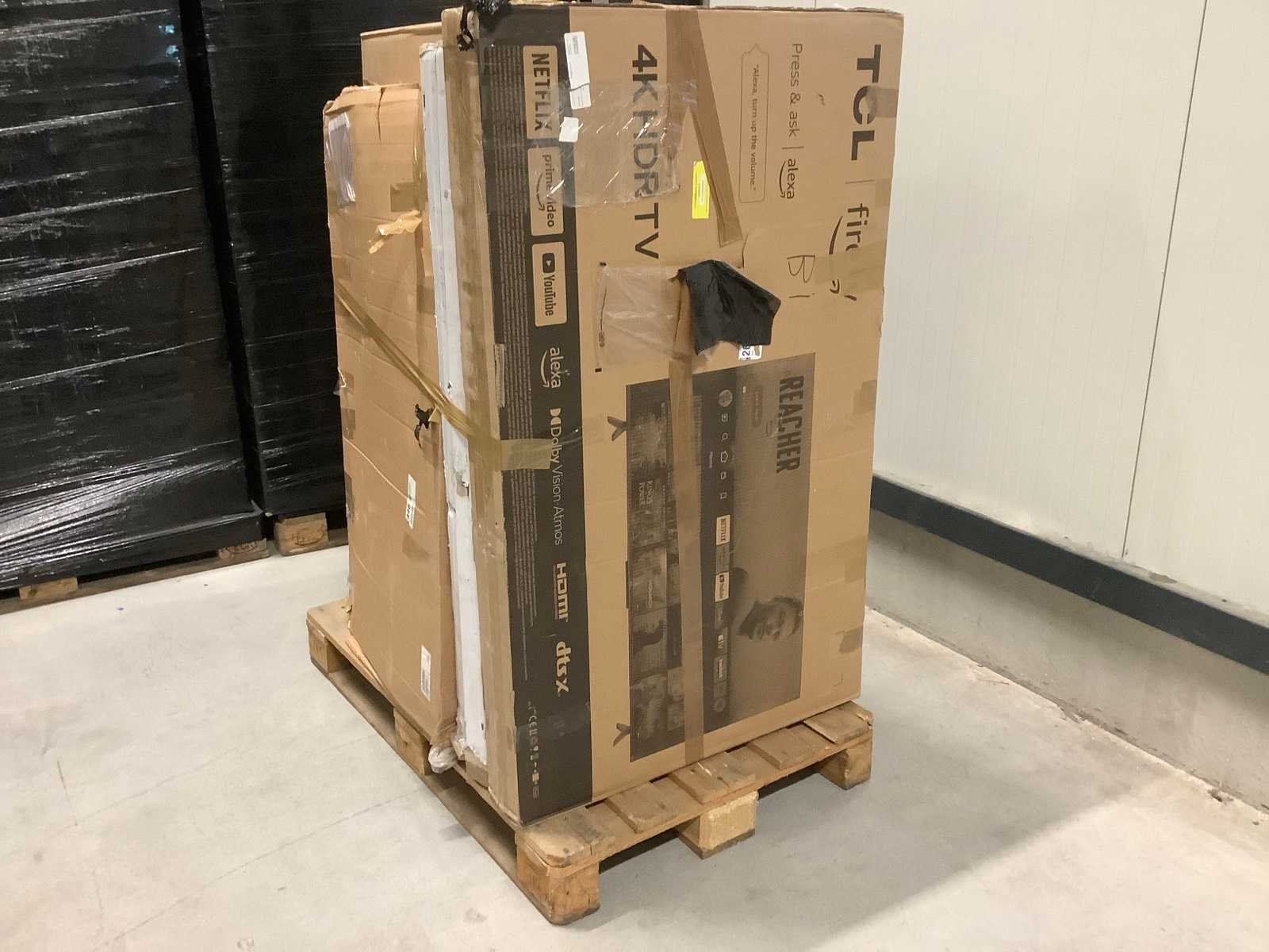 Dit betreft een partij televisies retourgoederen van een grote online retailer. De partij bestaat uit diverse diverse maten televisies. Aantal stuks: . Retailwaarde: De televisies zijn niet werkend en zijn te gebruiken voor onderdelen. Kom op de kijkdag om te om zo een goed beeld te krijgen van de reden van retour. Zie foto's voor lijst met inhoud. Merk: Pallet Retourgoederen