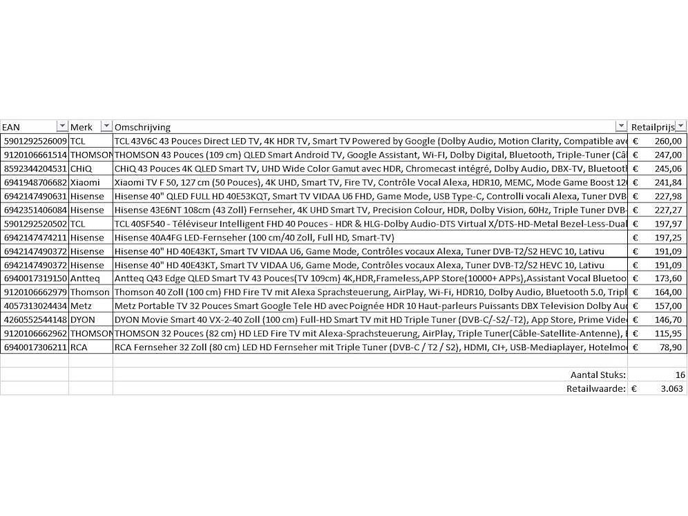 Dit betreft een partij televisies retourgoederen van een grote online retailer. De partij bestaat uit diverse diverse maten televisies. Aantal stuks: . Retailwaarde: De televisies zijn niet werkend en zijn te gebruiken voor onderdelen. Kom op de kijkdag om te om zo een goed beeld te krijgen van de reden van retour. Zie foto's voor lijst met inhoud. Merk: Pallet Retourgoederen