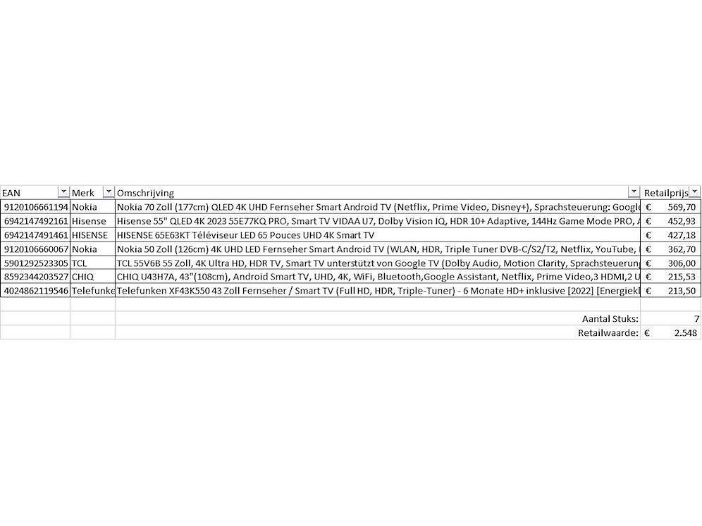 Dit betreft een partij televisies retourgoederen van een grote online retailer. De partij bestaat uit diverse diverse maten televisies. Aantal stuks: . Retailwaarde: De televisies zijn niet werkend en zijn te gebruiken voor onderdelen. Kom op de kijkdag om te om zo een goed beeld te krijgen van de reden van retour. Zie foto's voor lijst met inhoud. Merk: Pallet Retourgoederen