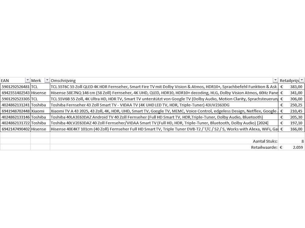 Dit betreft een partij televisies retourgoederen van een grote online retailer. De partij bestaat uit diverse diverse maten televisies. Aantal stuks: . Retailwaarde: De televisies zijn niet werkend en zijn te gebruiken voor onderdelen. Kom op de kijkdag om te om zo een goed beeld te krijgen van de reden van retour. Zie foto's voor lijst met inhoud. Merk: Pallet Retourgoederen