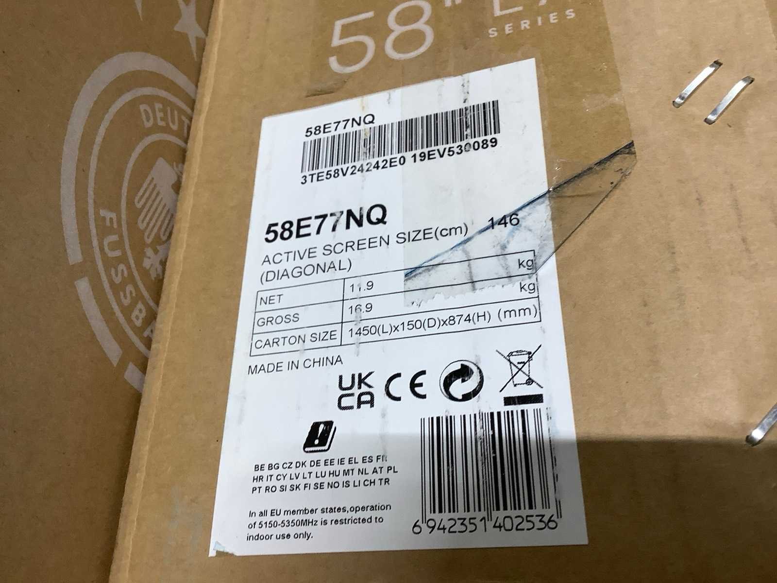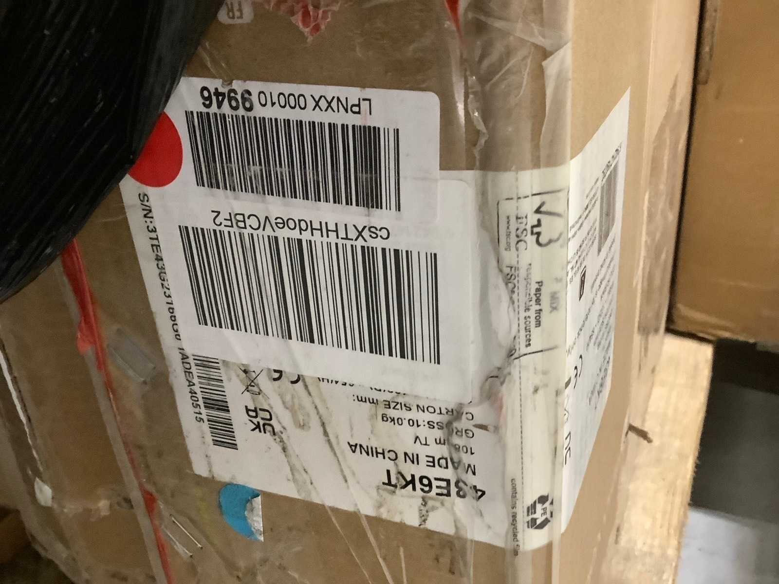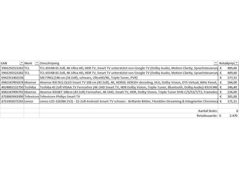 Dit betreft een partij televisies retourgoederen van een grote online retailer. De partij bestaat uit diverse diverse maten televisies. Aantal stuks: . Retailwaarde: De televisies zijn niet werkend en zijn te gebruiken voor onderdelen. Kom op de kijkdag om te om zo een goed beeld te krijgen van de reden van retour. Zie foto's voor lijst met inhoud. Merk: Pallet Retourgoederen