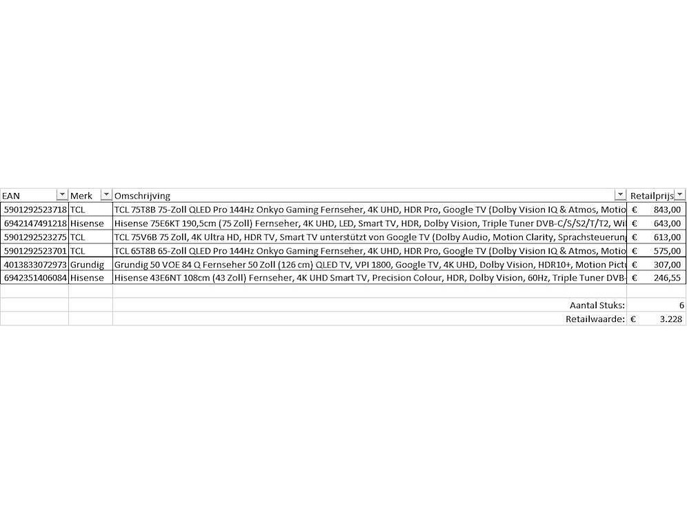 Dit betreft een partij televisies retourgoederen van een grote online retailer. De partij bestaat uit diverse diverse maten televisies. Aantal stuks: . Retailwaarde: De televisies zijn niet werkend en zijn te gebruiken voor onderdelen. Kom op de kijkdag om te om zo een goed beeld te krijgen van de reden van retour. Zie foto's voor lijst met inhoud. Merk: Pallet Retourgoederen