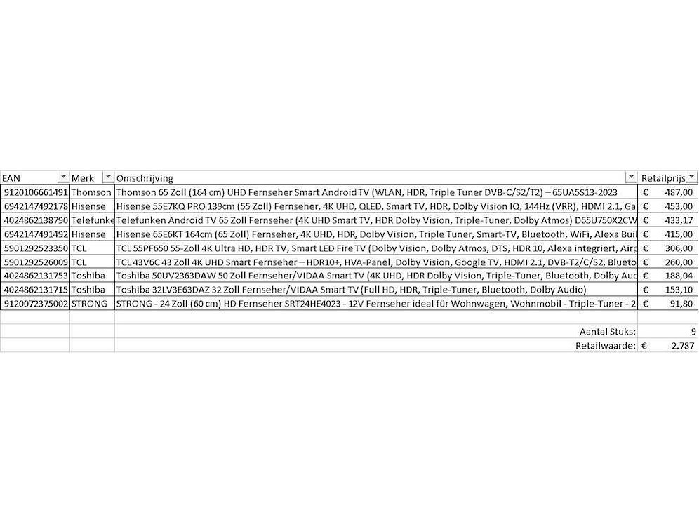 Dit betreft een partij televisies retourgoederen van een grote online retailer. De partij bestaat uit diverse diverse maten televisies. Aantal stuks: . Retailwaarde: De televisies zijn niet werkend en zijn te gebruiken voor onderdelen. Kom op de kijkdag om te om zo een goed beeld te krijgen van de reden van retour. Zie foto's voor lijst met inhoud. Merk: Pallet Retourgoederen