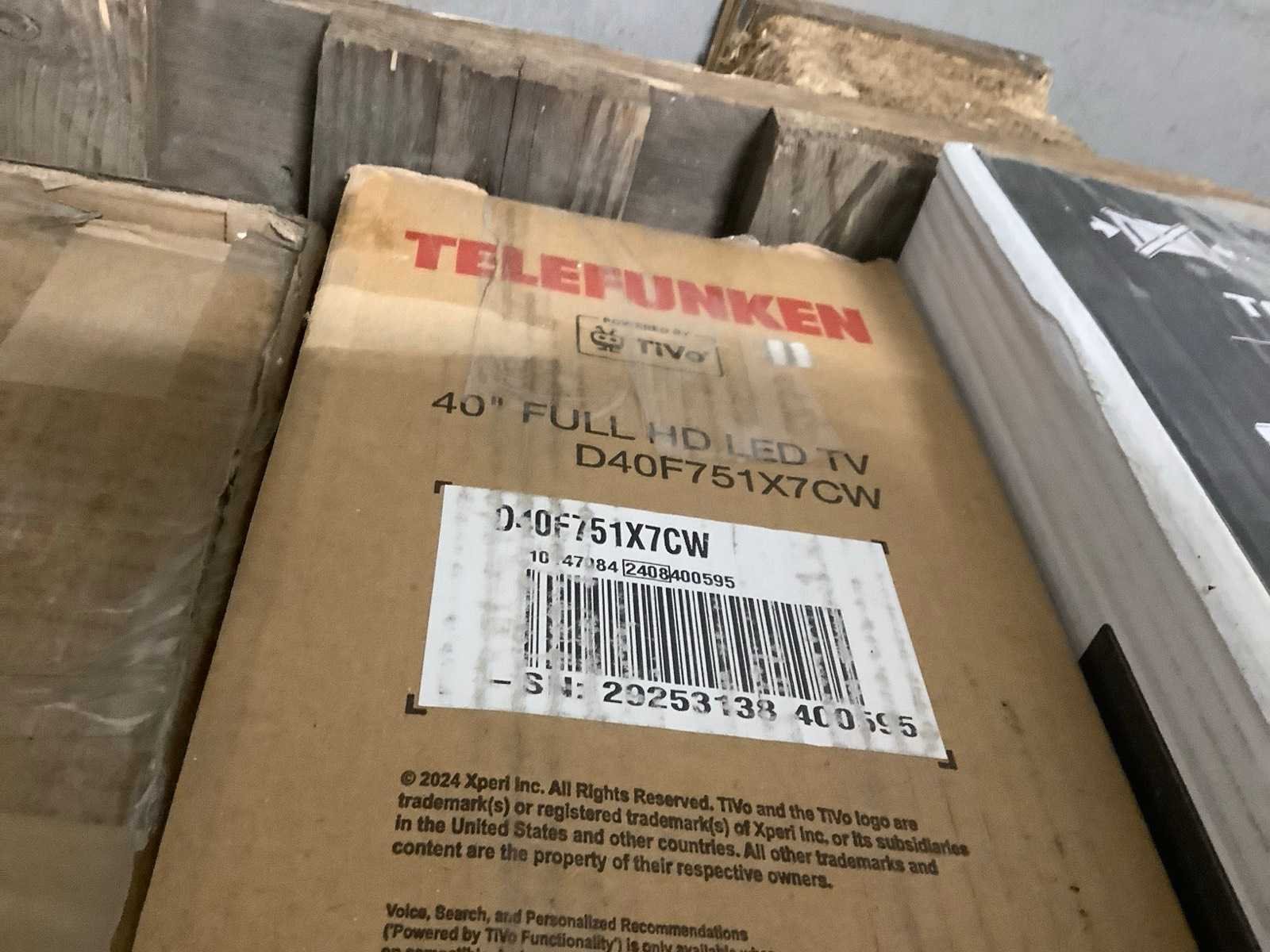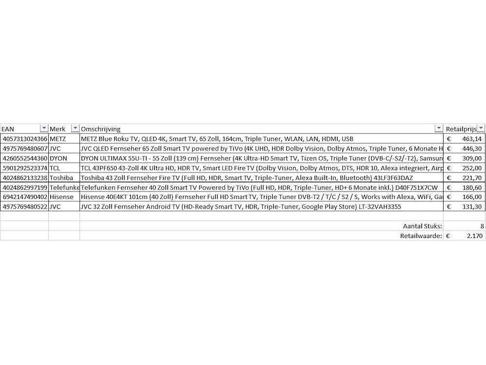 Dit betreft een partij televisies retourgoederen van een grote online retailer. De partij bestaat uit diverse diverse maten televisies. Aantal stuks: . Retailwaarde: De televisies zijn niet werkend en zijn te gebruiken voor onderdelen. Kom op de kijkdag om te om zo een goed beeld te krijgen van de reden van retour. Zie foto's voor lijst met inhoud. Merk: Pallet Retourgoederen
