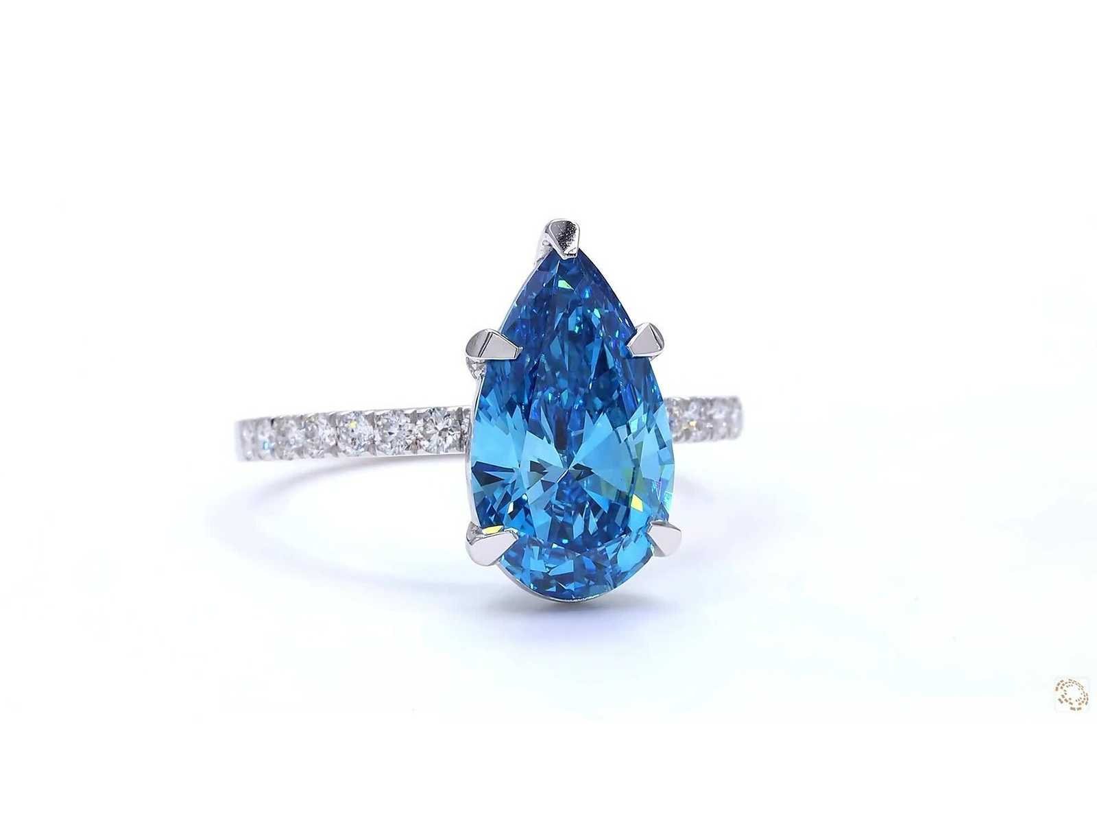 Exclusieve 18K witgouden ring Ringmaat - 57 EU / 17 IT / 8 US Rapportnummer IGI: LG715572713 Total Carat - 3,35 Carat Peervorm: Parelmoer Karaatgewicht van de hoofsteen: 3,01 Kleur: Fancy levendig blauw Helderheid: VVS2 Symmetrie: uitstekend Omringende stenen - 0,34 (16 stuks) Totale ringgewicht: 3.030 gram Bezichtiging op afspraak Materiaal: Witgoud Ringmaat : 57 Certificaat: Ja Lage schatting: 7400€