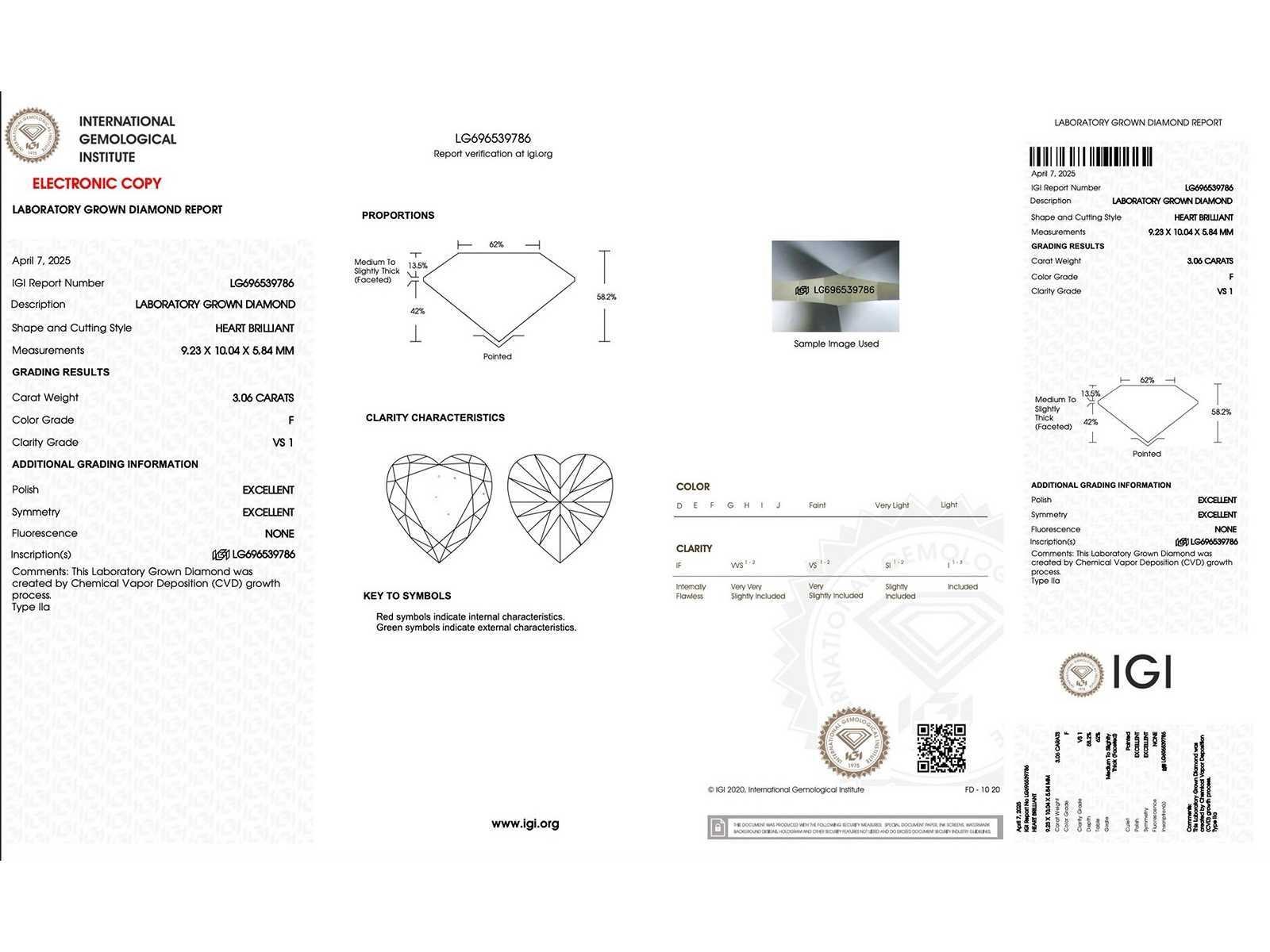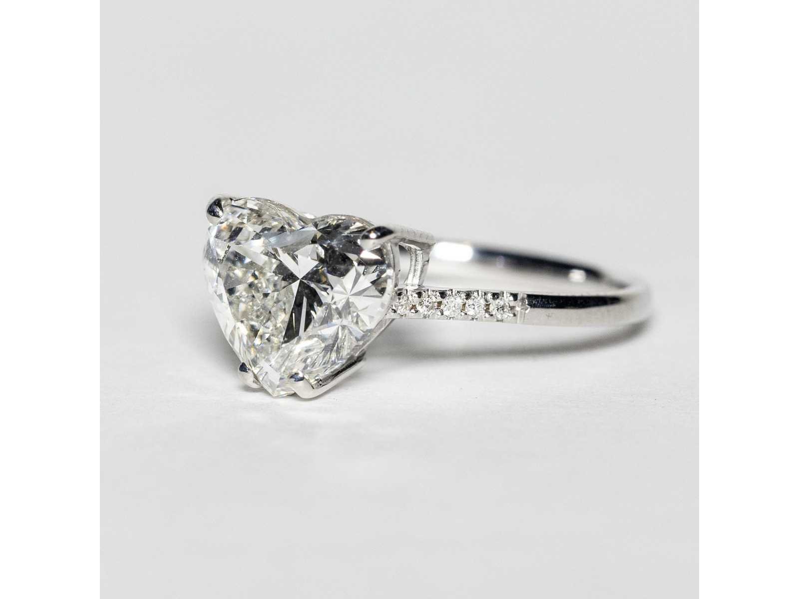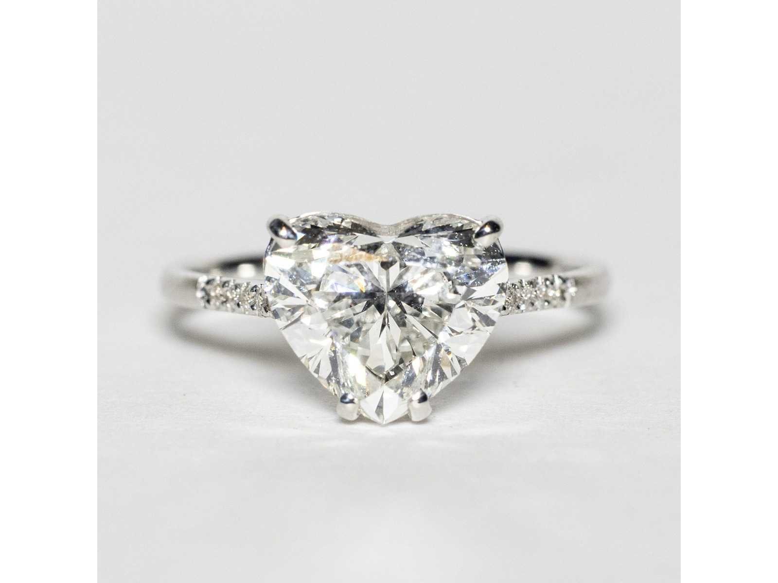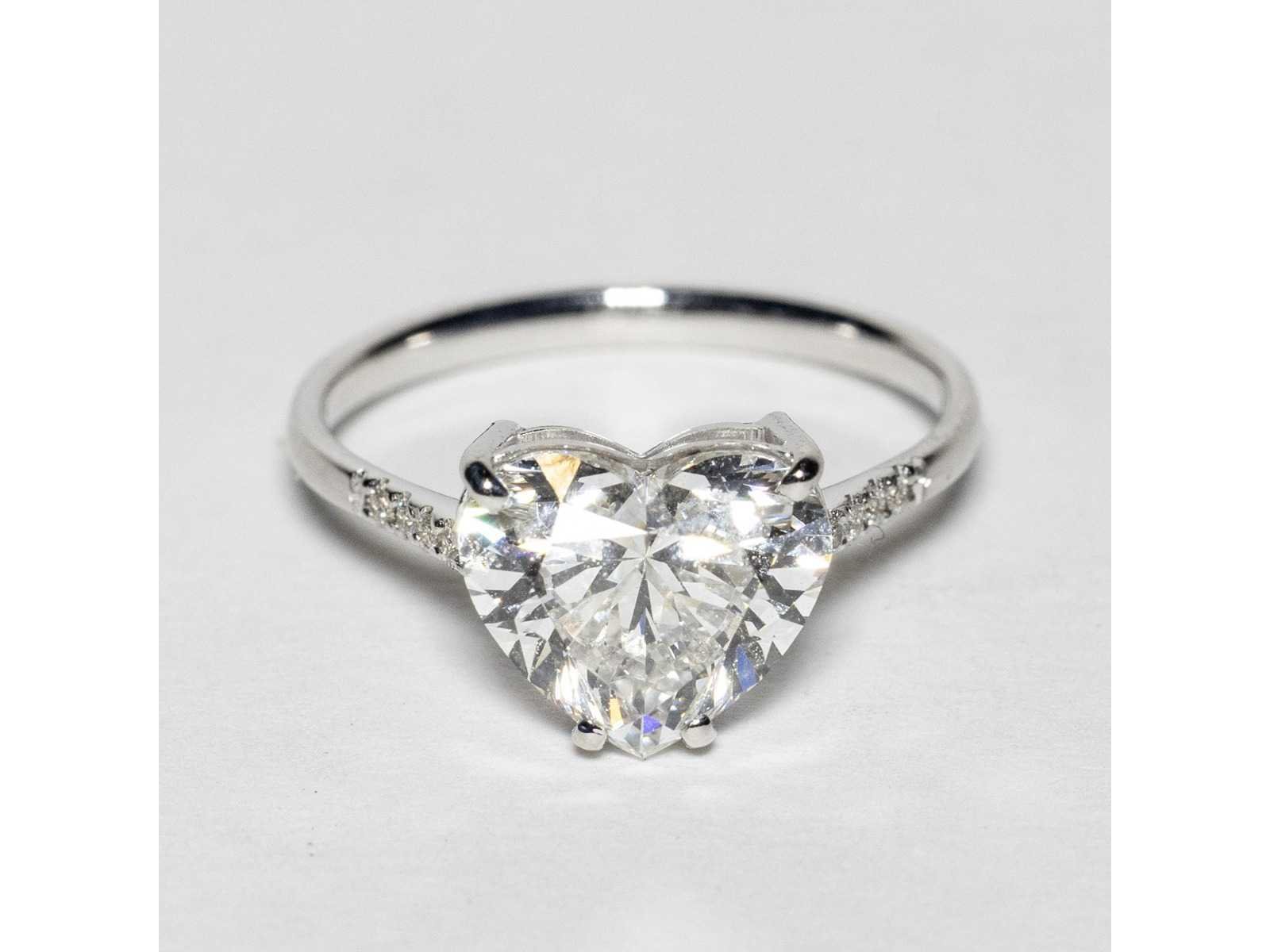 Laboratoriumrapport IGI: LG696539786 Ring in wit 18KT Maat Ring 14/54/6-1/2 Diamantvormig hoofd: Hart Totale grootte: 3,11 ct Hoofdsteen: 3,06 ct Kleur: F Symmetrie: uitstekend Fluorescentie: geen Helderheid: VS1 Aantal diamanten: 10 Omringende diamanten karaat: 0,05 ct (0,005 per diamant) Totaal gewicht van de ring: 2,5 g Bezichtiging op afspraak Materiaal: Witgoud Ringmaat : 54 Lage schatting: 5100€