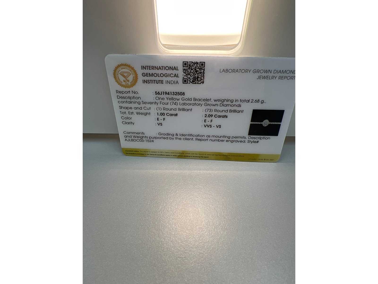 IGI Sieraden Certificaat: 56J194132508 Tennisarmband Polsmaat: 18 cm Vorm en slijpvorm: ronde briljant Karaatgewicht: 74 stuks / 3,09 ct Kleurgradatie: E - F Helderheidsgraad: vs-vvs1 Bezichtiging op afspraak Materiaal: Geelgoud Certificaat: Ja Lage schatting: 3300€