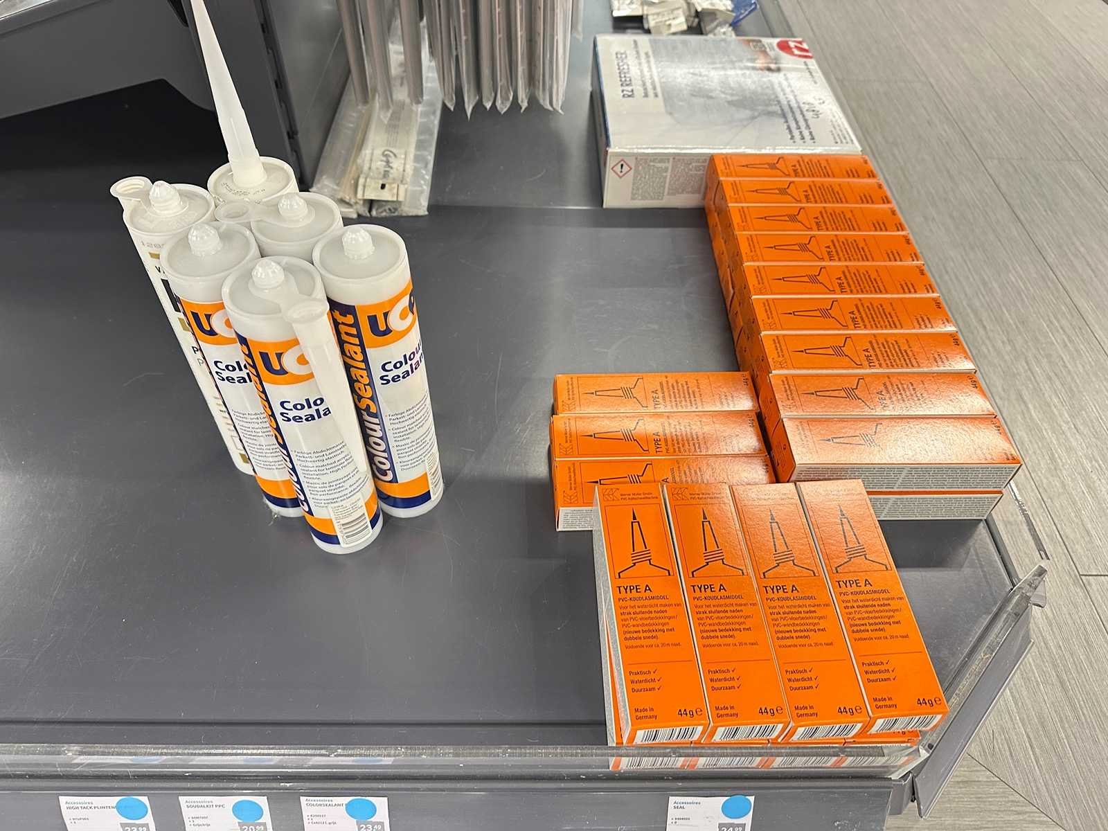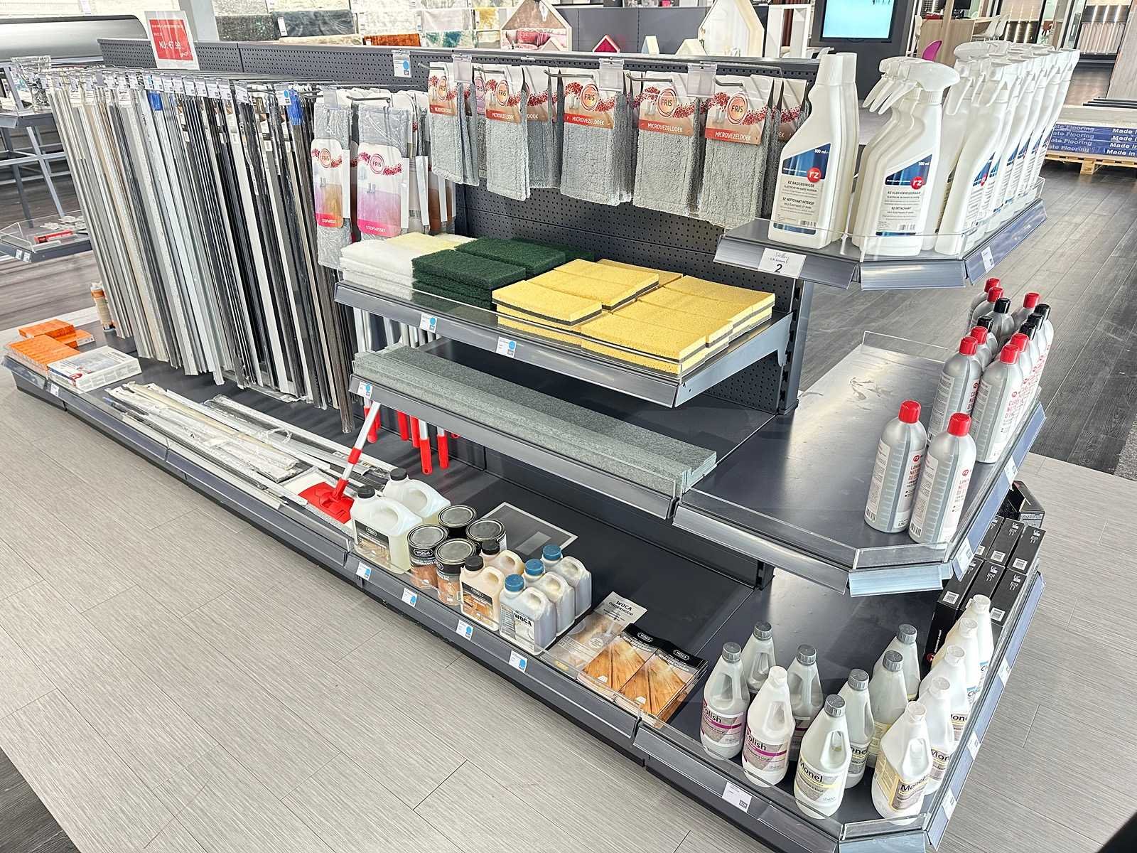 Deze partij bestaat uit onderhoudsproducten, ondervloeren, meubelvilten, plinten en overige accessoires. Exclusief stelling.