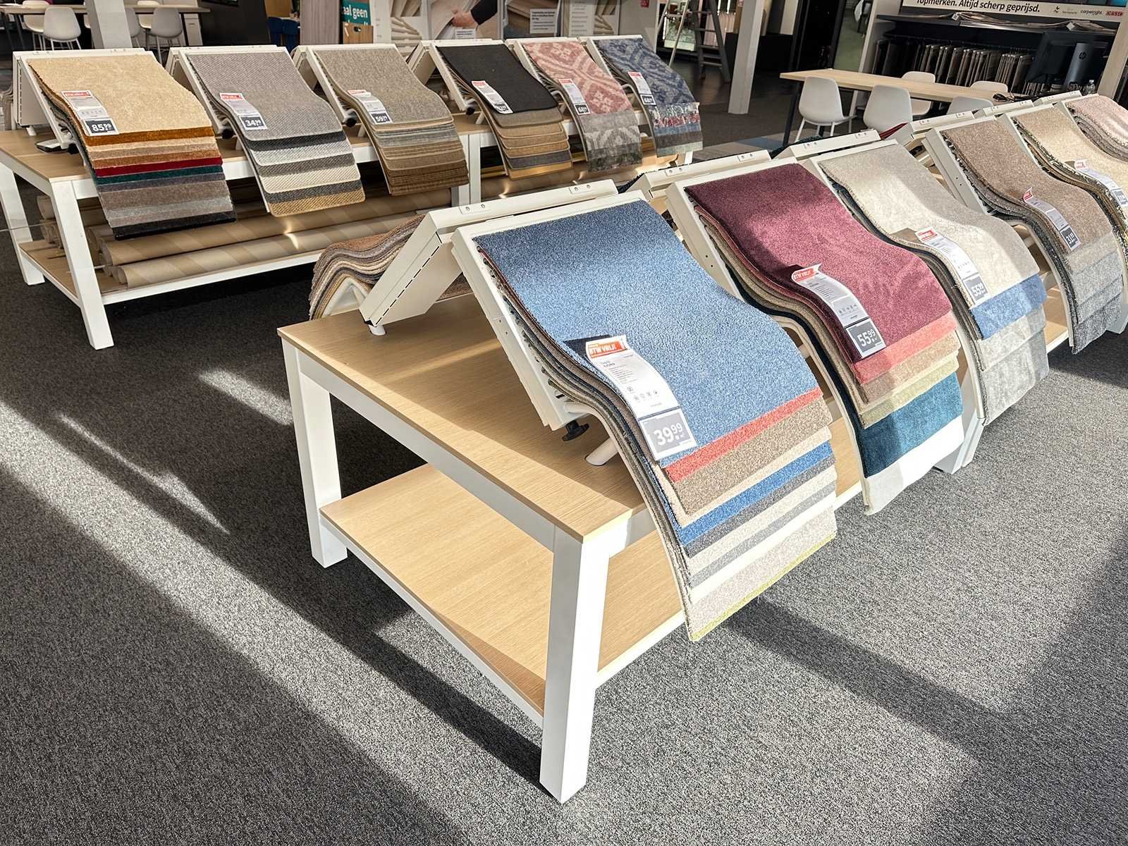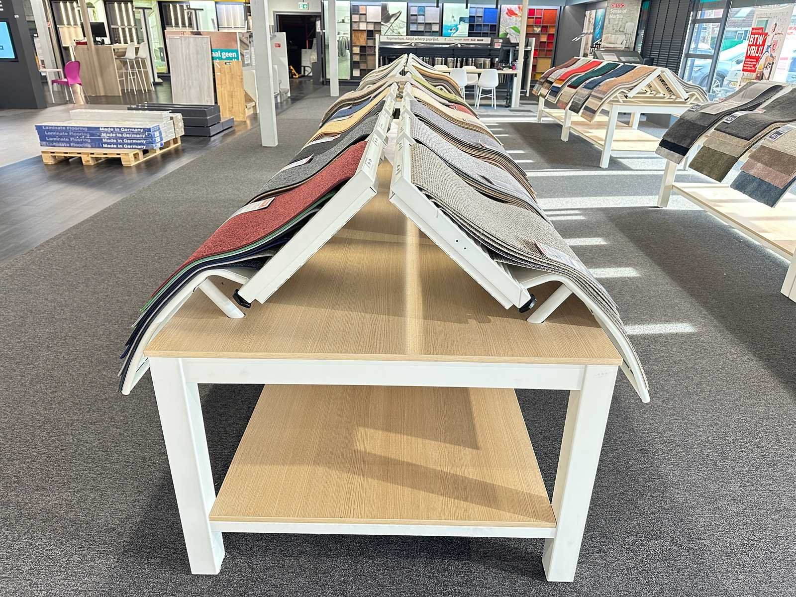 De stalen displays zijn geïntegreerd in de tafel en zijn verstelbaar. In totaal 72 displays bij dit kavel waarvan een groot deel voorzien van samples. Totale afmeting L: 2090mm Totale afmeting Breedte: 1100mm Totale afmeting Hoogte: 750mm