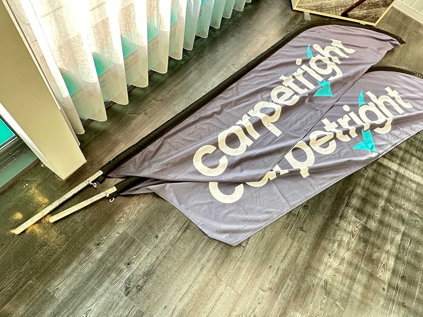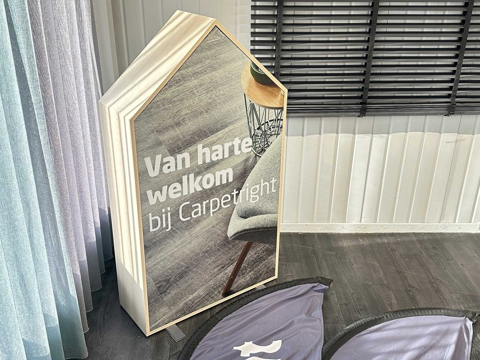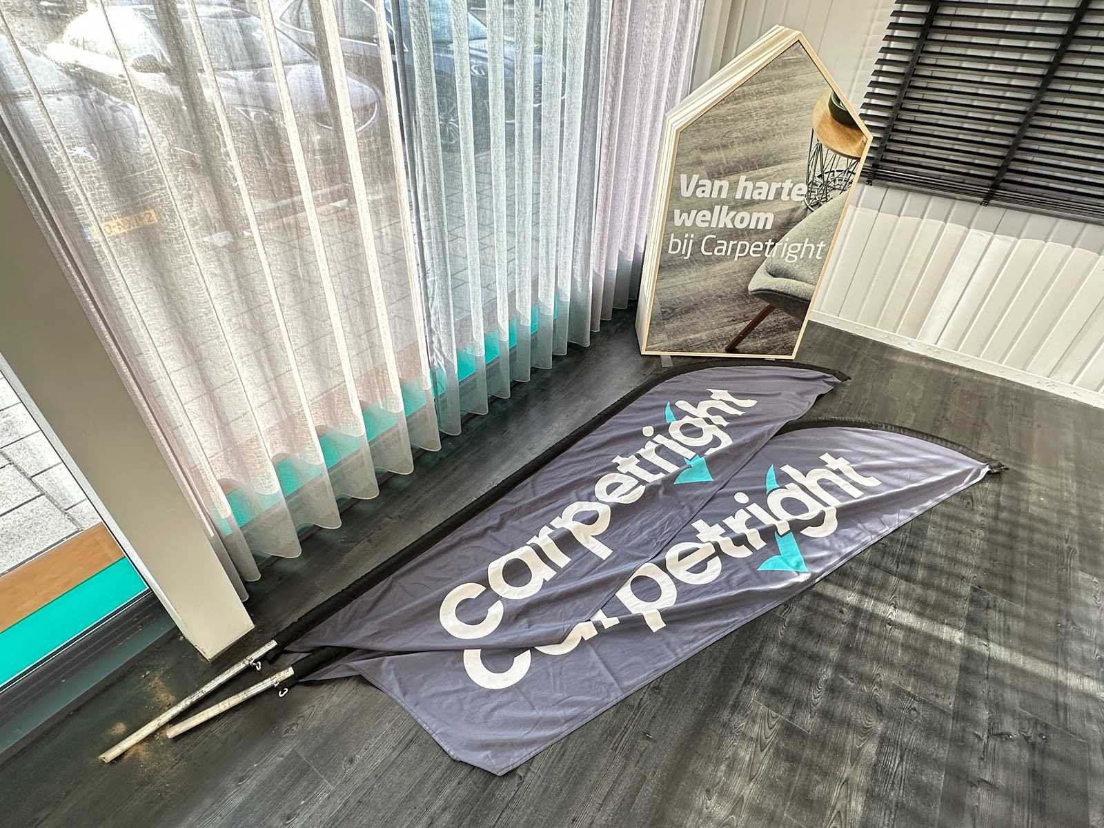 Afmeting van het houten element "Welkom" is 80x30x140 cm (BxDxH). Lengte van de beachvlag is 300 cm