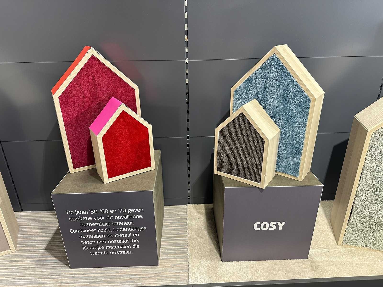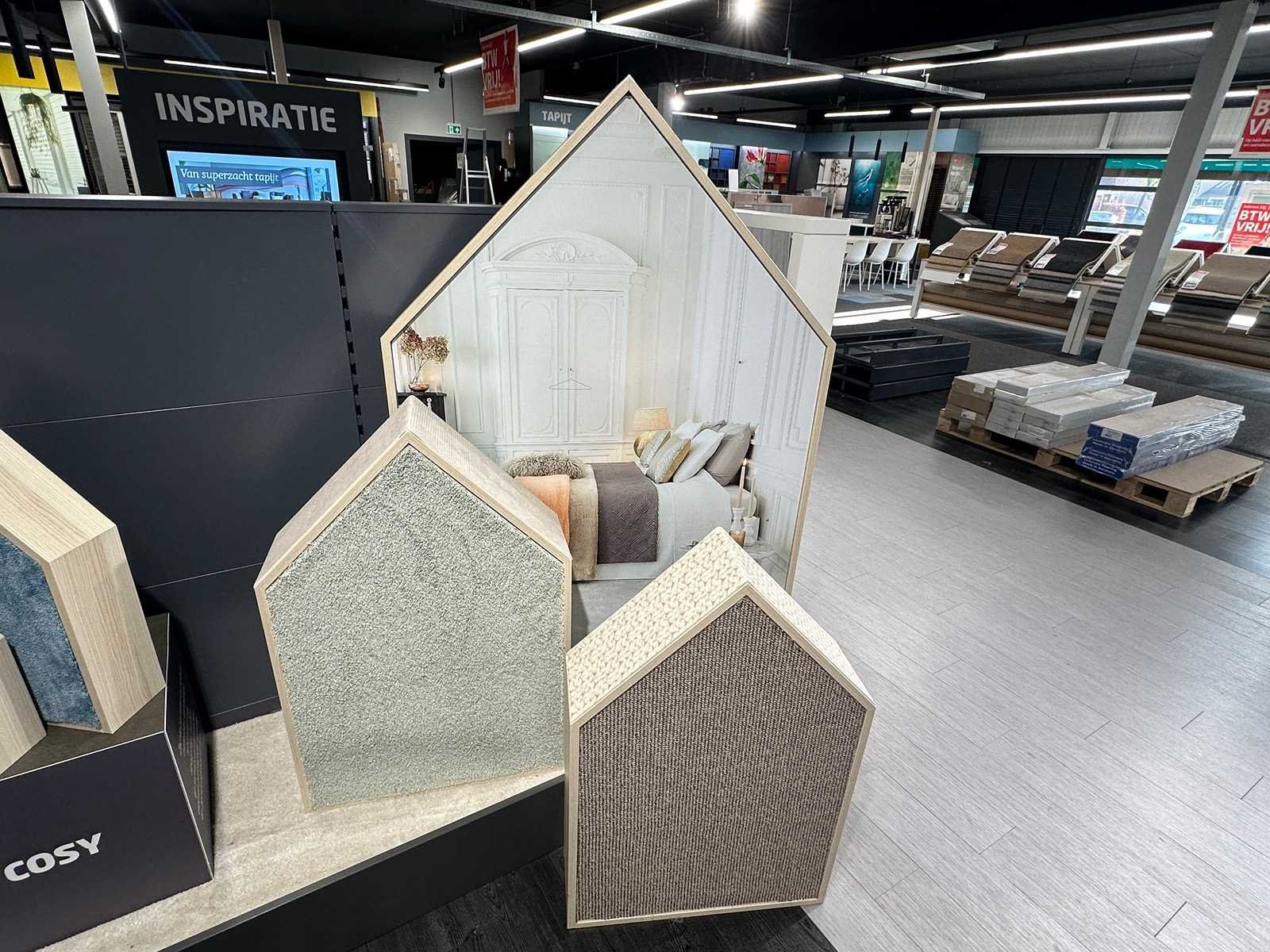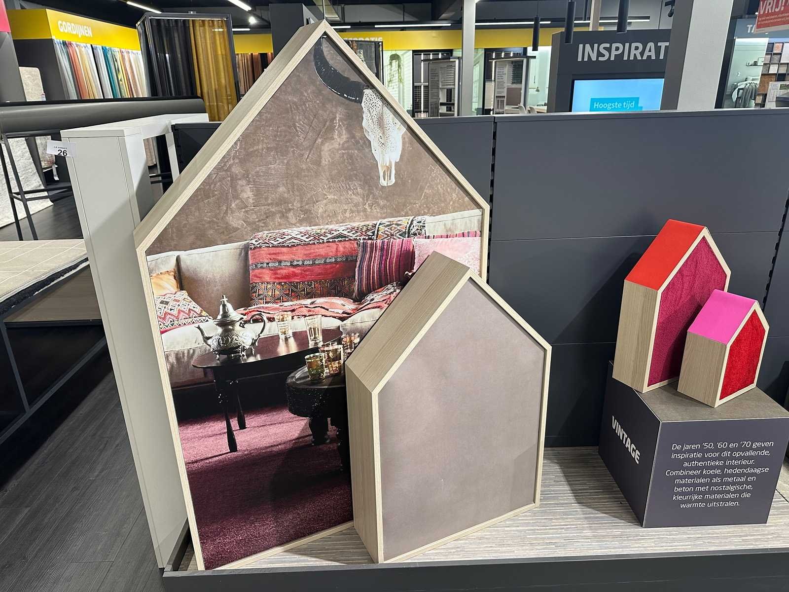 De afmetingen van deze houten decoratieve huisvormen zijn verschillend. De afmeting van de kleinste is 23x12x32 cm (BxDxH) en de grootste is 98x20x150 cm (BxDxH)