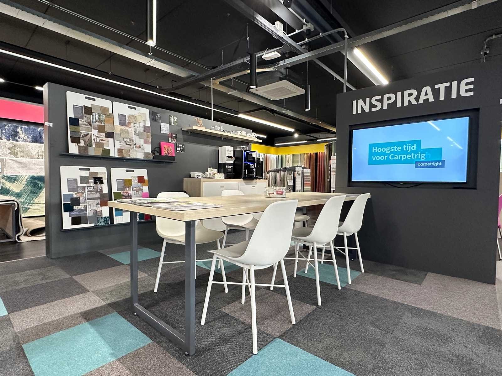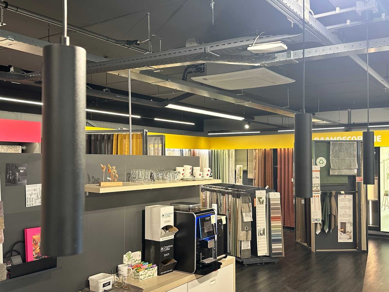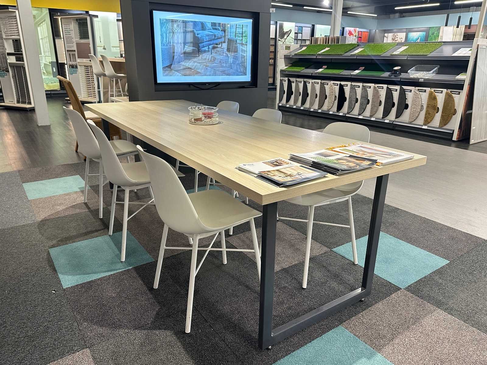 Vergadertafel met 6 crassevig stoelen en 3 hanglampen