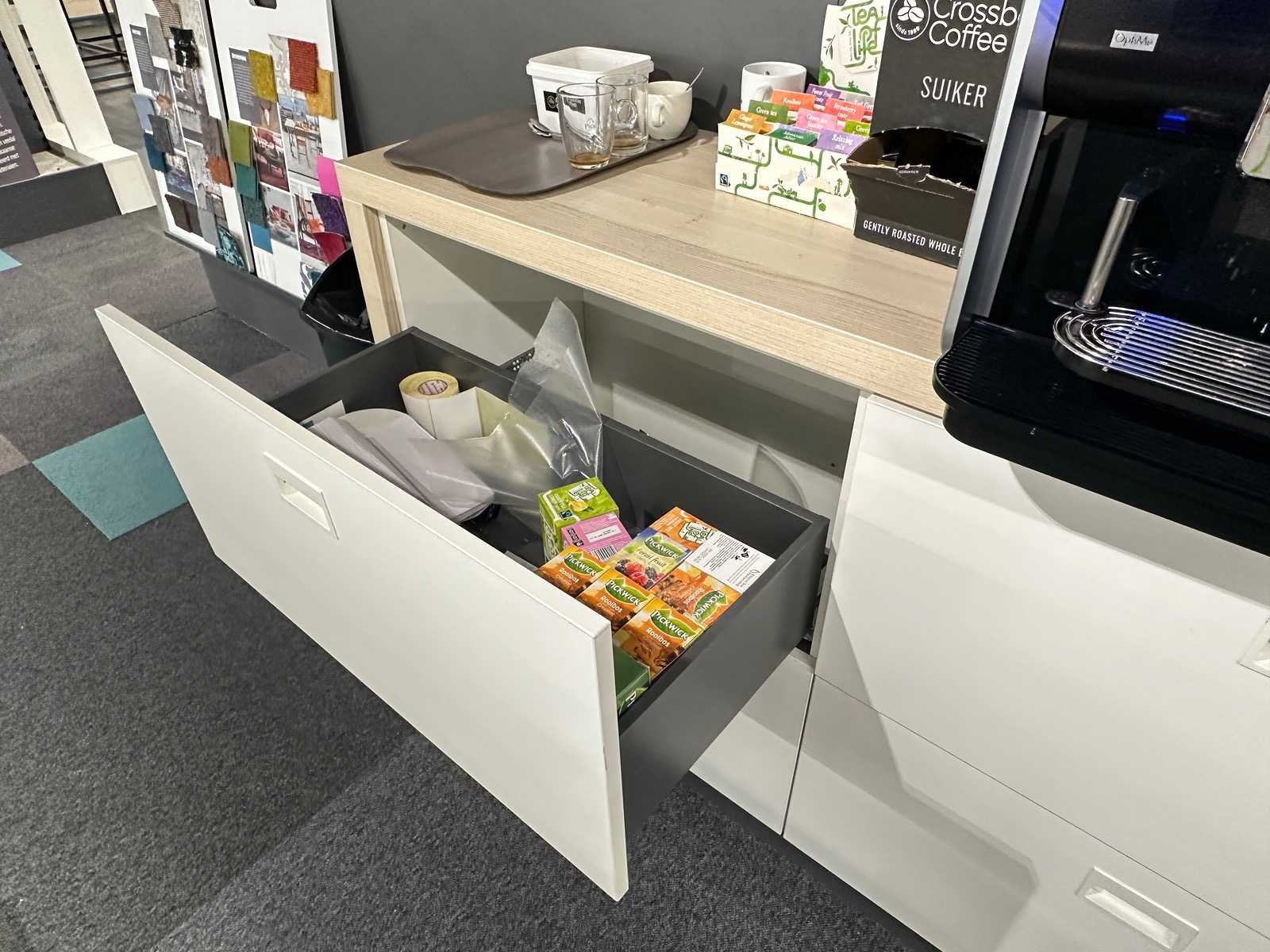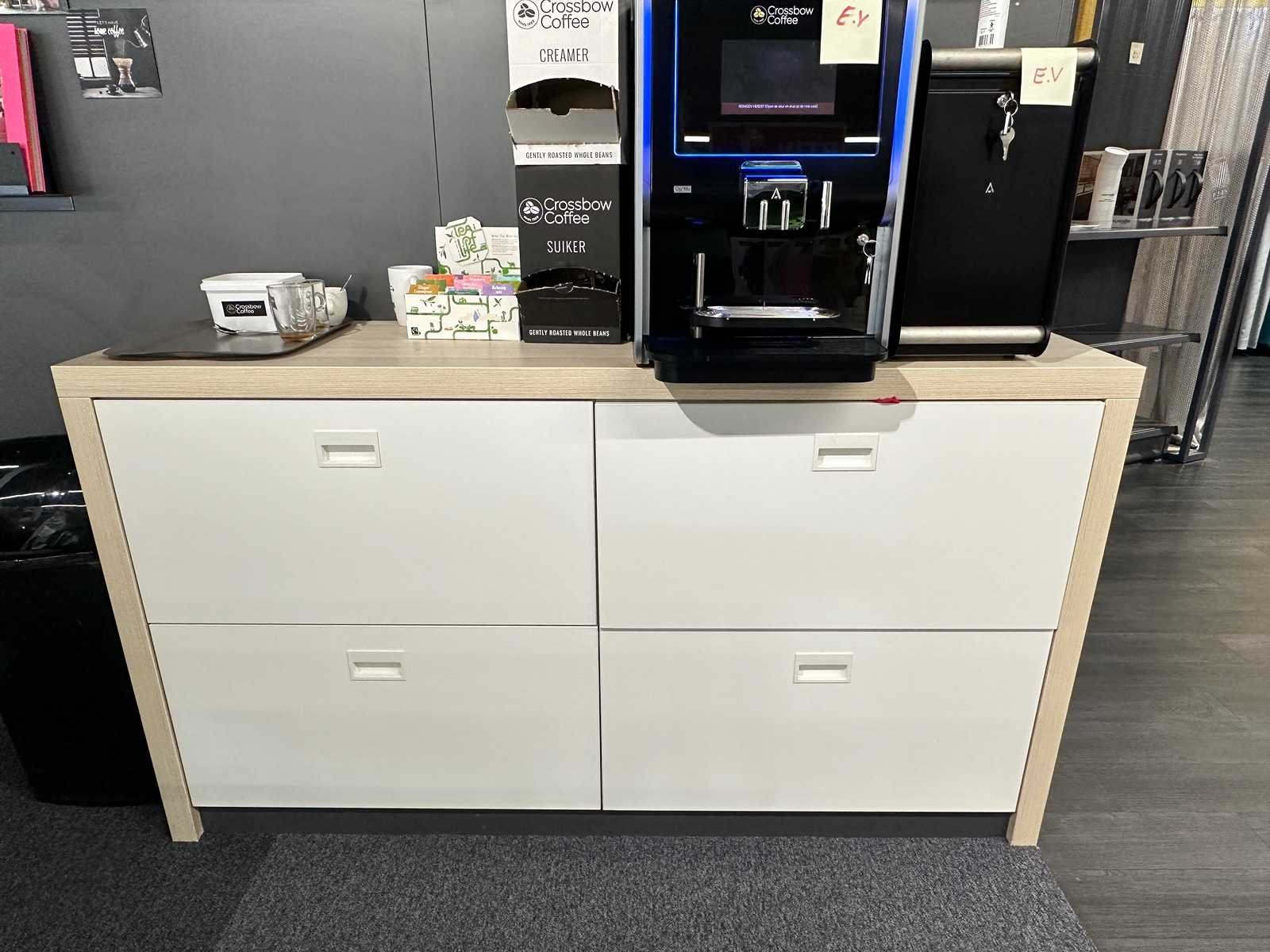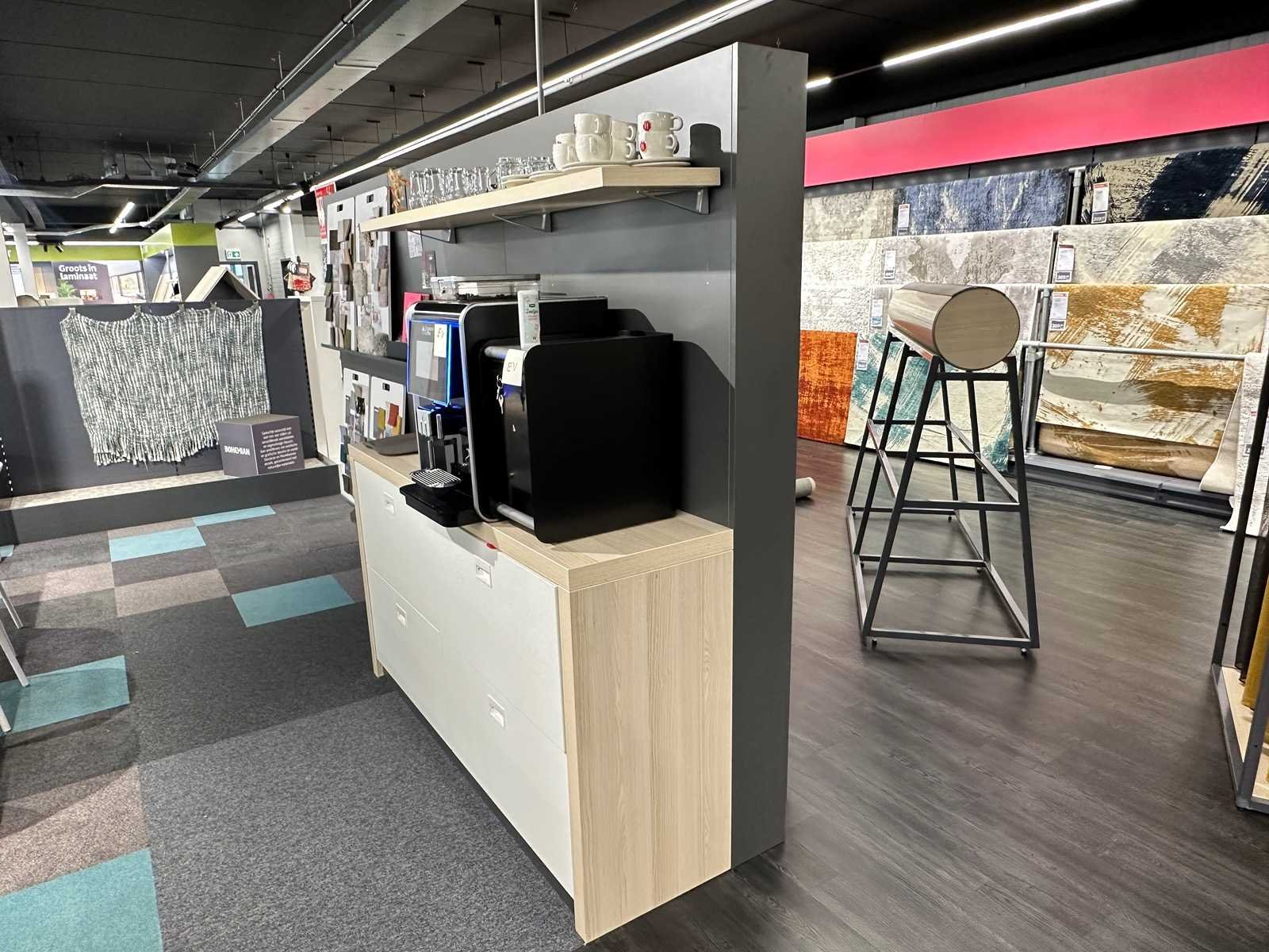 De afmeting van het houten dressoir is 170x46x95 cm (BxDxH). Inclusief inhoud van het dressoir en theedisplay. Exclusief de koffiemachine. Totale afmeting L: 3500mm Totale afmeting Breedte: 200mm Totale afmeting Hoogte: 2000mm