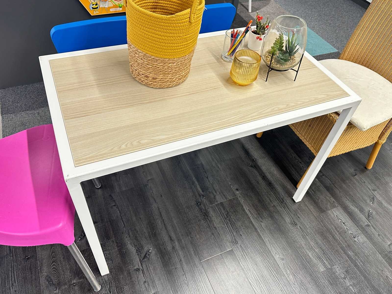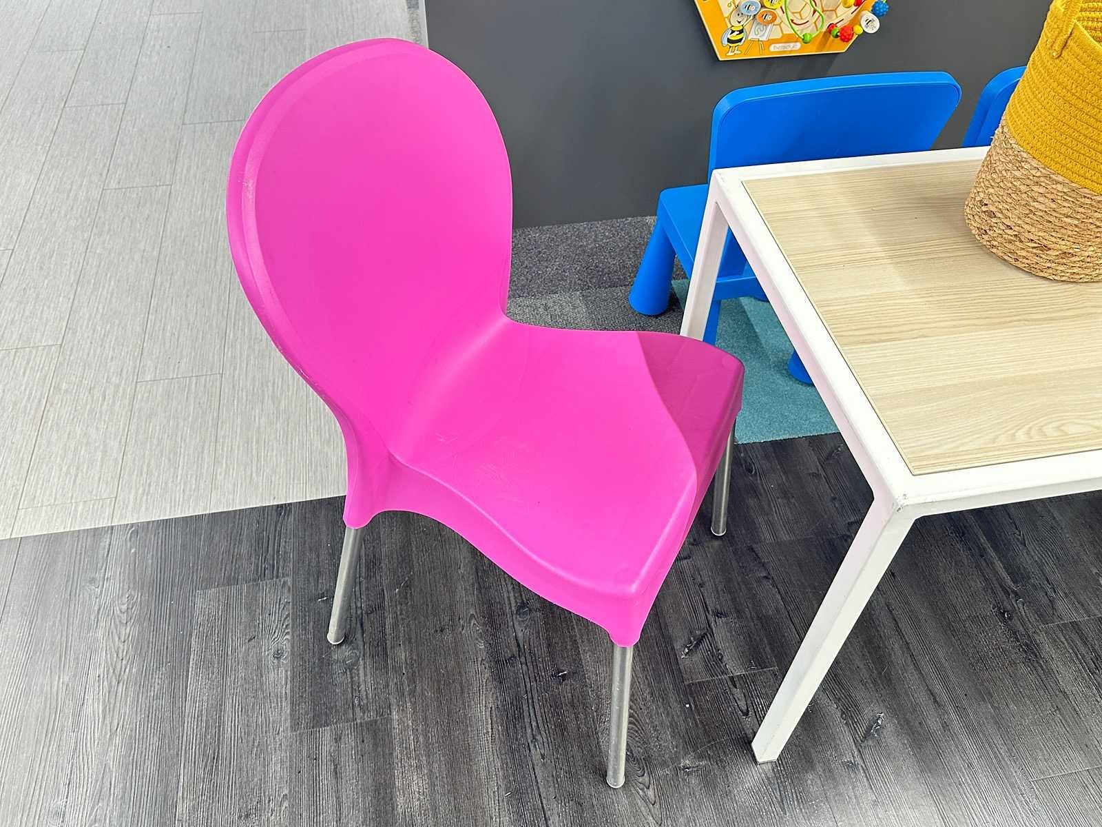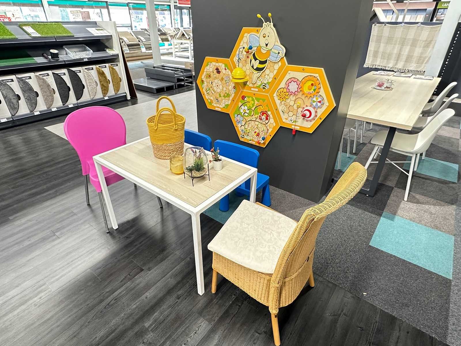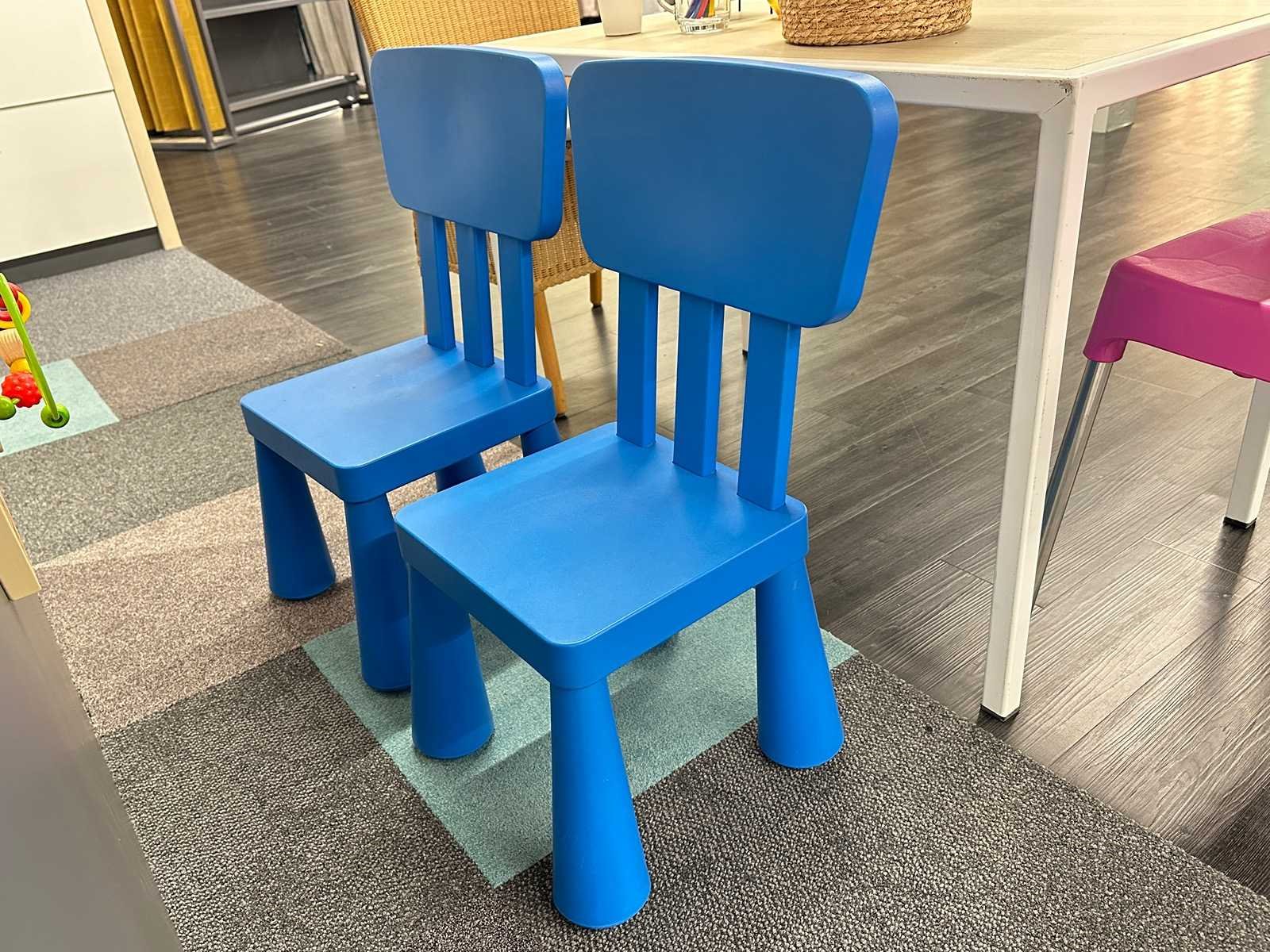 Inclusief twee blauwe kunststof kinderstoeltjes, tafel en twee stoelen. Merk: Beleduc