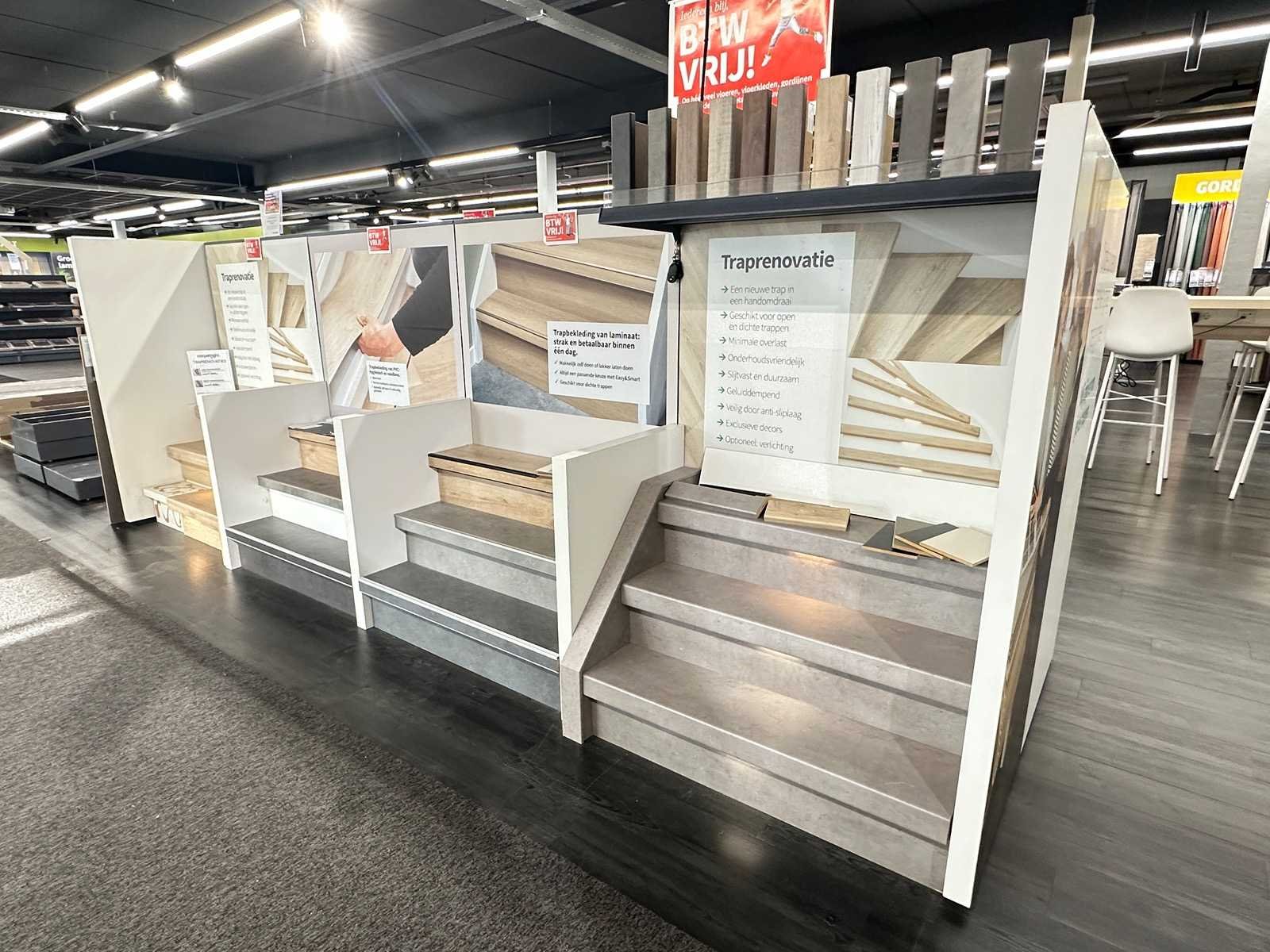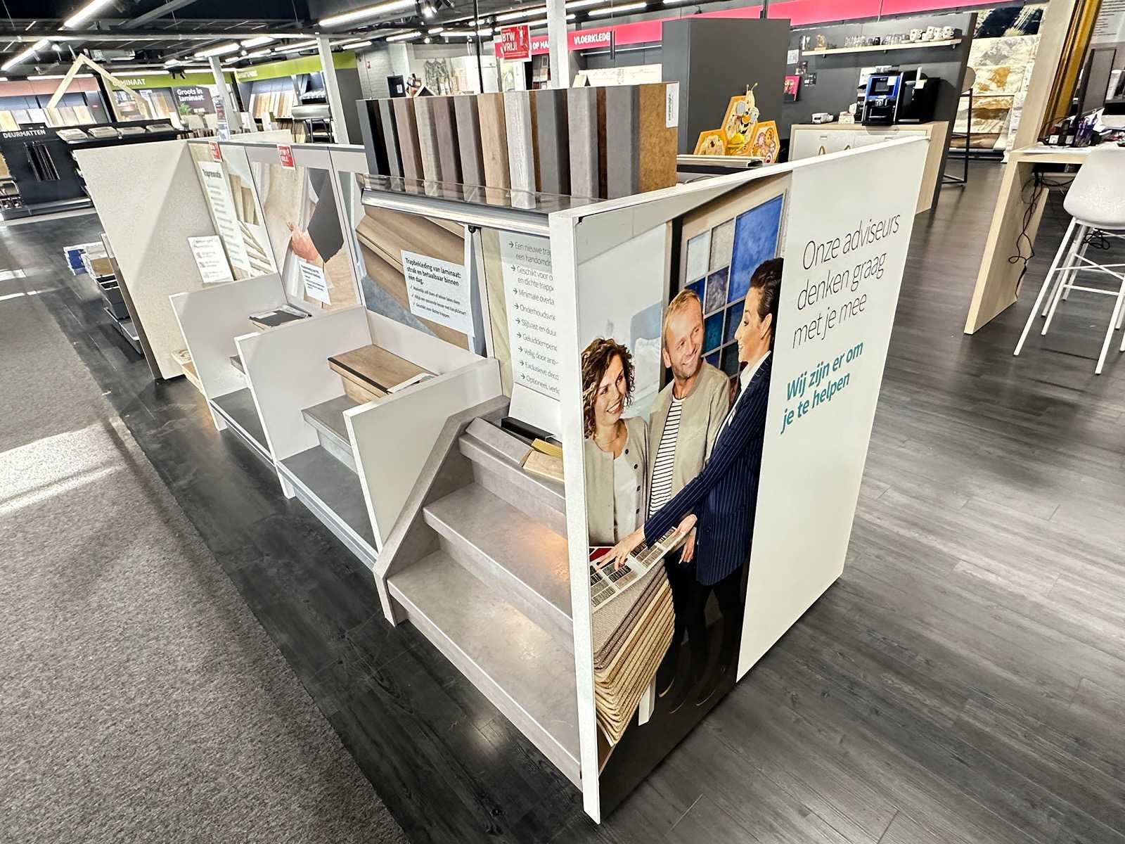 Deze stalen vrijstaande dubbelzijdige winkelstelling wordt verkocht inclusief samples, exclusief trapbekleding aan één zijde. Staal: true